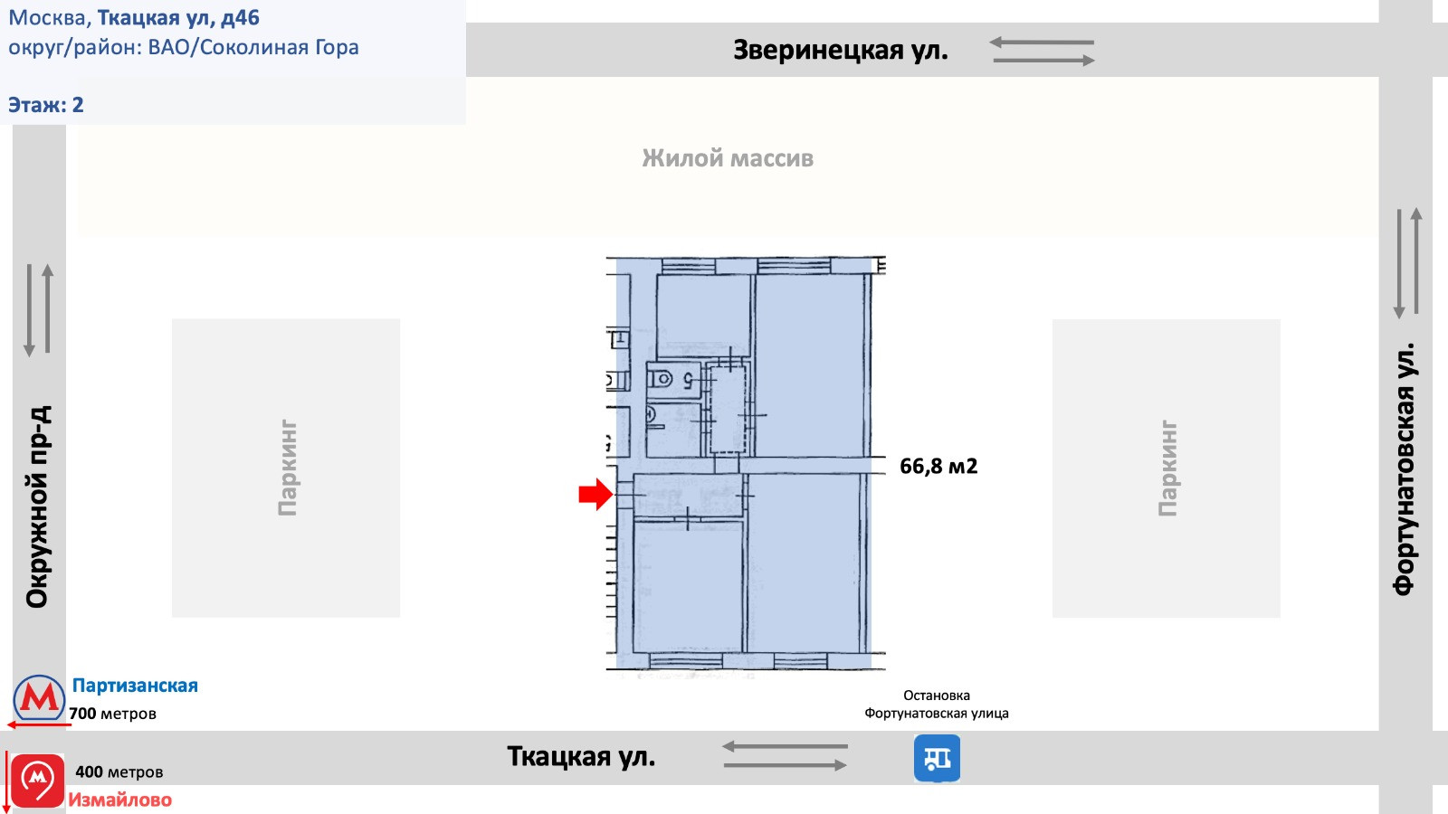 3-комнатная квартира, 66.8 м2, этаж 2 / 5, на продажу в Москве, Ткацкая улица, 46