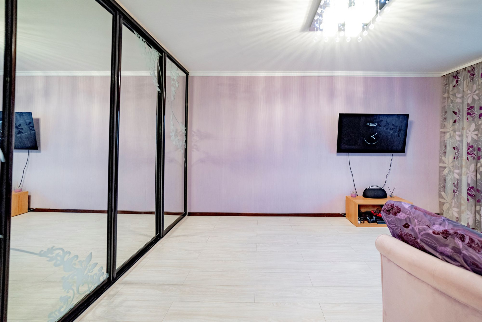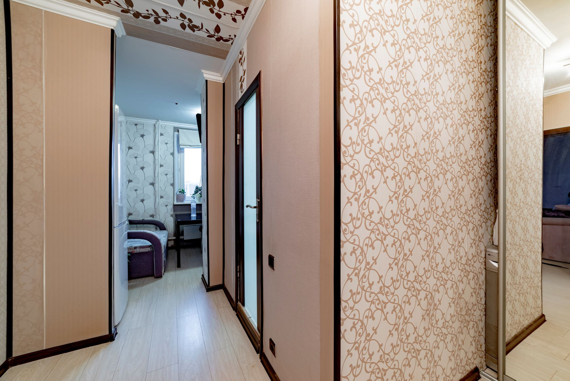 В квартире выполнен ремонт из качественных материалов. На полу в коридоре, на кухне и в комнате установлен ламинат, в санузле установлена качественная влагостойкая панель до потолка.