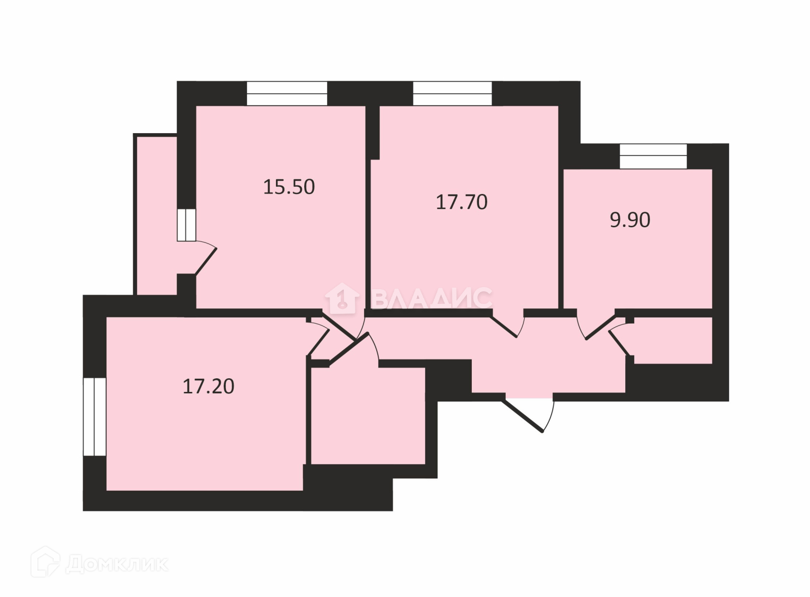В квартире три изолированные комнаты-17,7+17,2+15,5м.кв