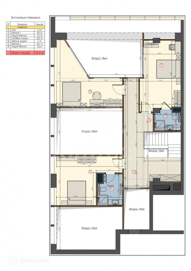 второй уровень - две спальни с ванными комнатами и комната свободного назначения.