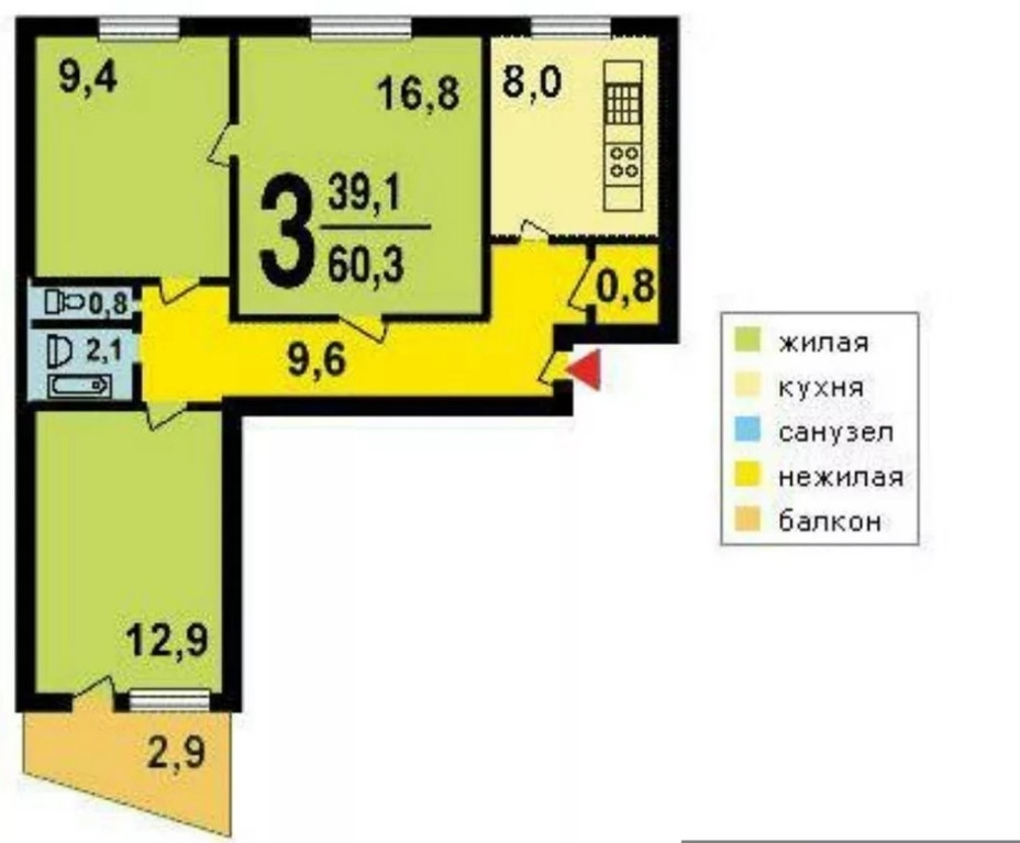 Жилая площадь 39.4 м2
