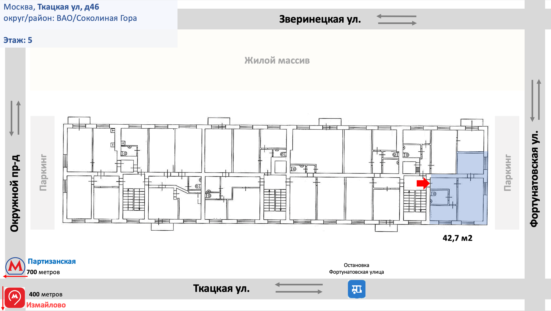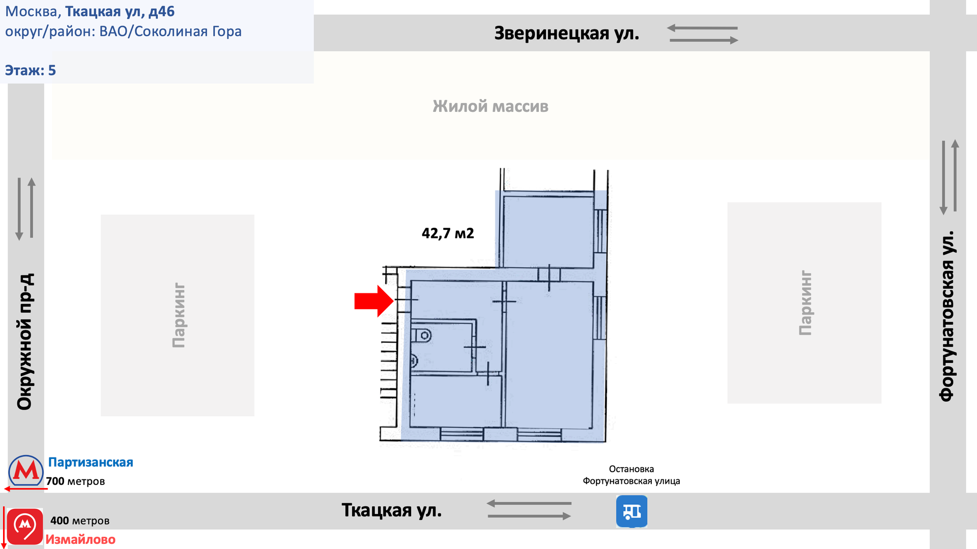 2-комнатная квартира, 42.7 м2, этаж 5 / 5, на продажу в Москве, Ткацкая улица, 46