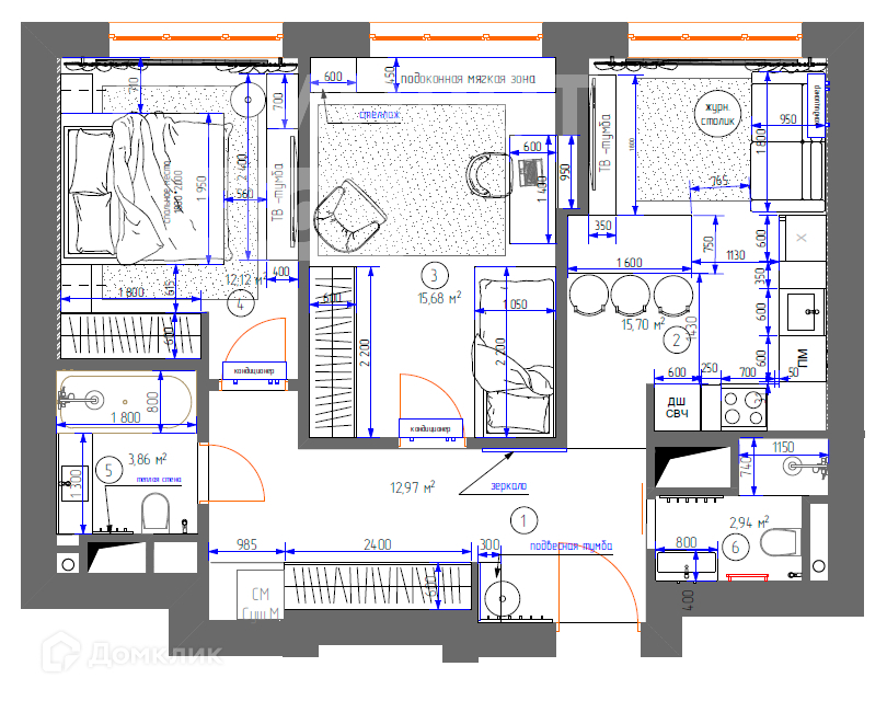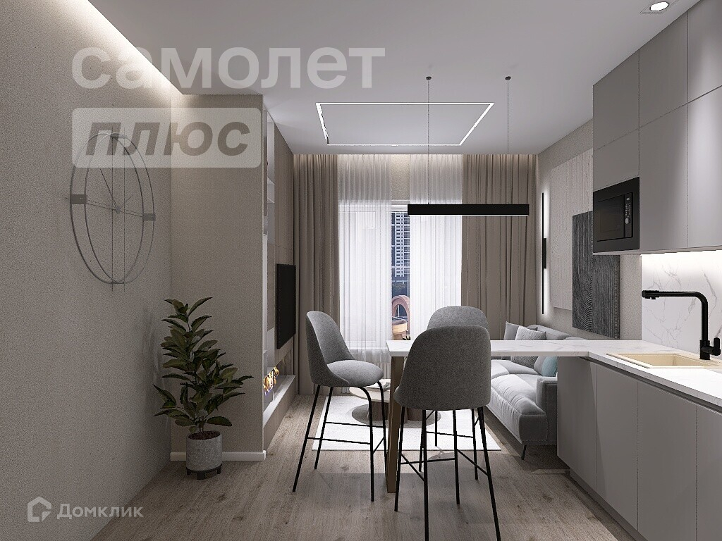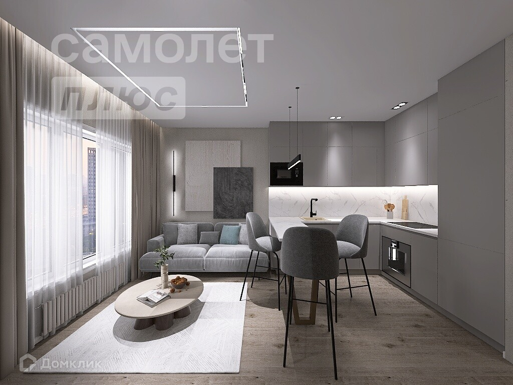 - Эргономичная кухня-гостиная (варочная панель, духовой шкаф, посудомоечная машина, вытяжка, встроенный холодильник марки Kuppersberg) с мягкой зоной