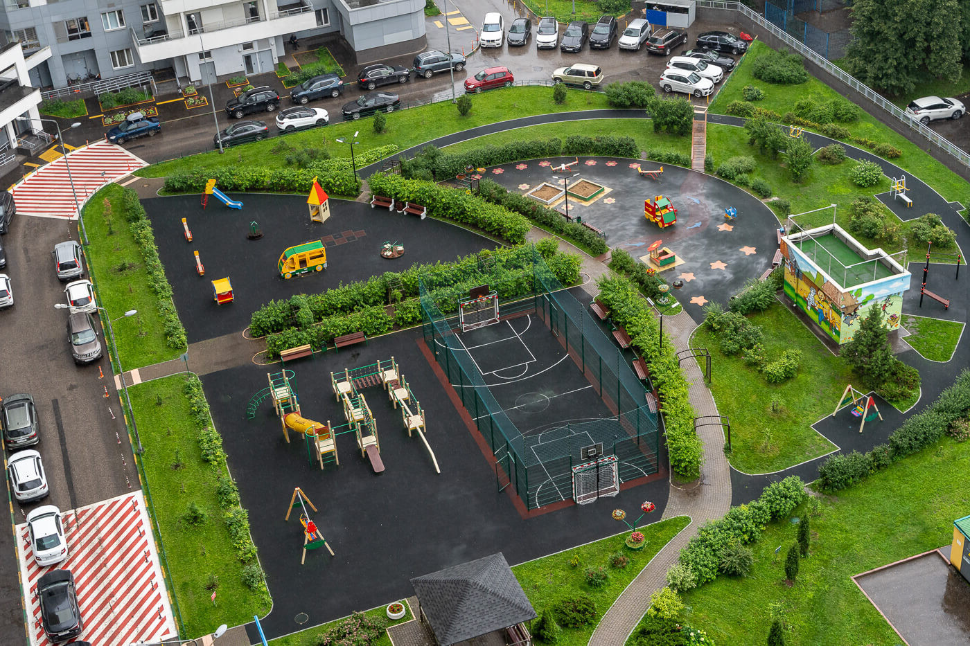 Внутри большого и красивого двора находятся безопасные детские, прогулочные и спортивные площадки (баскетбол, воркаут)