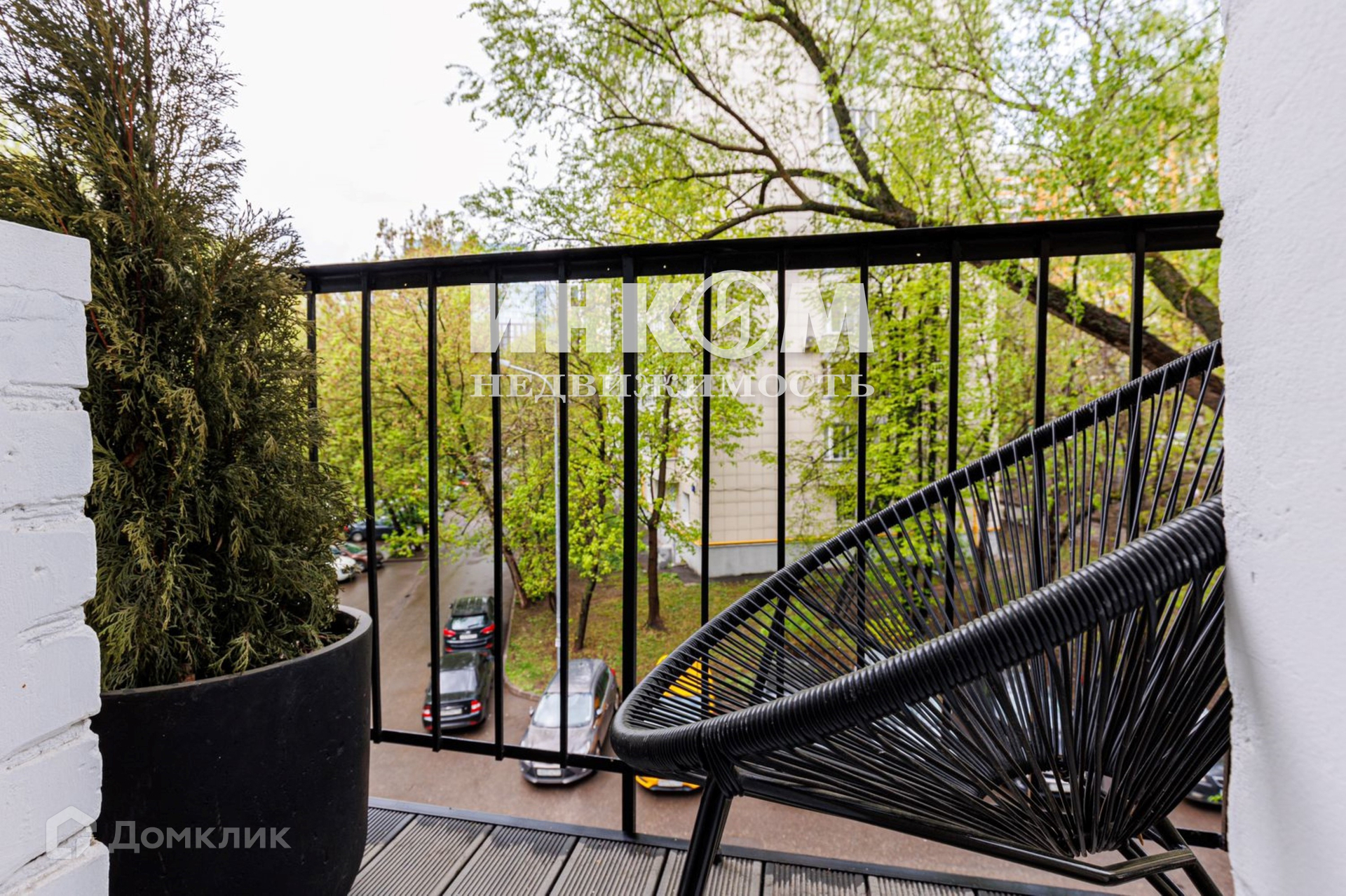 На балконе уложена террасная доска, высажены туя, размещено удобное дизайнерское кресло, в котором приятно начать день с чашечкой ароматного кофе.