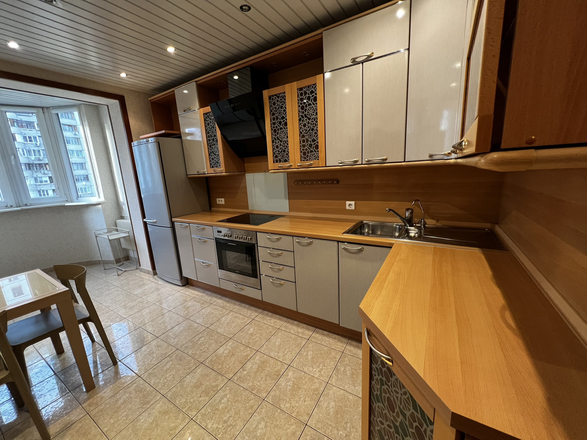 Кухня 12 кв м, укомплектована необходимой техникой и кухонным гарнитуром финского производства, на полу красивая итальянская плитка. Окна выходят во двор на запад.