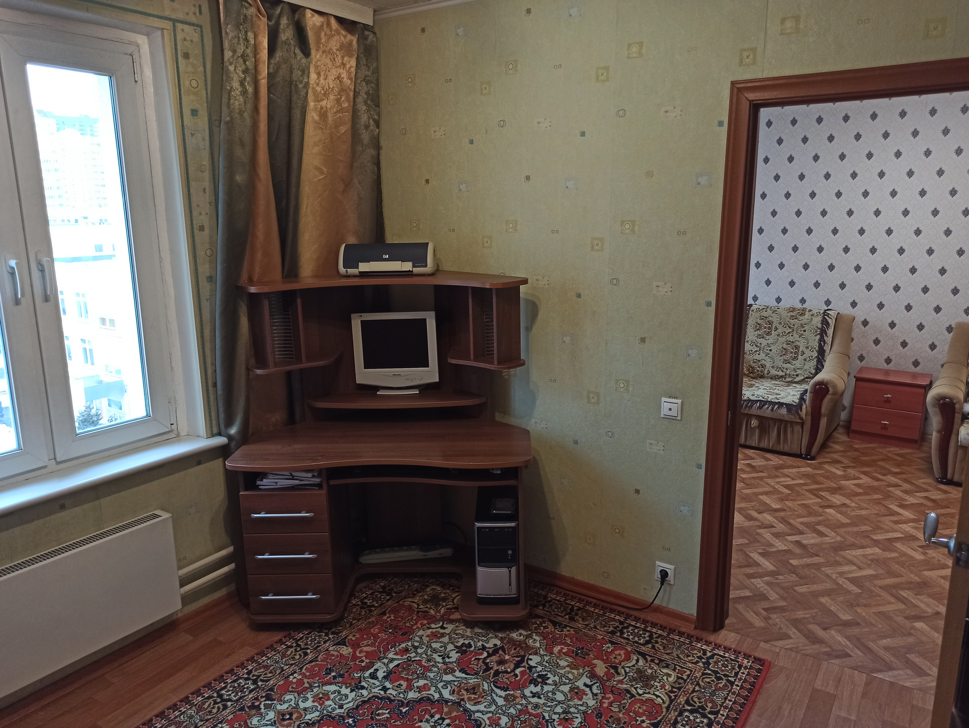 Во дворе находятся, библиотека,детская площадка, площадка для кроссфита, магазин круглосуточный, детский сад. Из окон комнат видно 2 школы , 1 детский сад,тцсо. С балкона окна тоже во двор.
