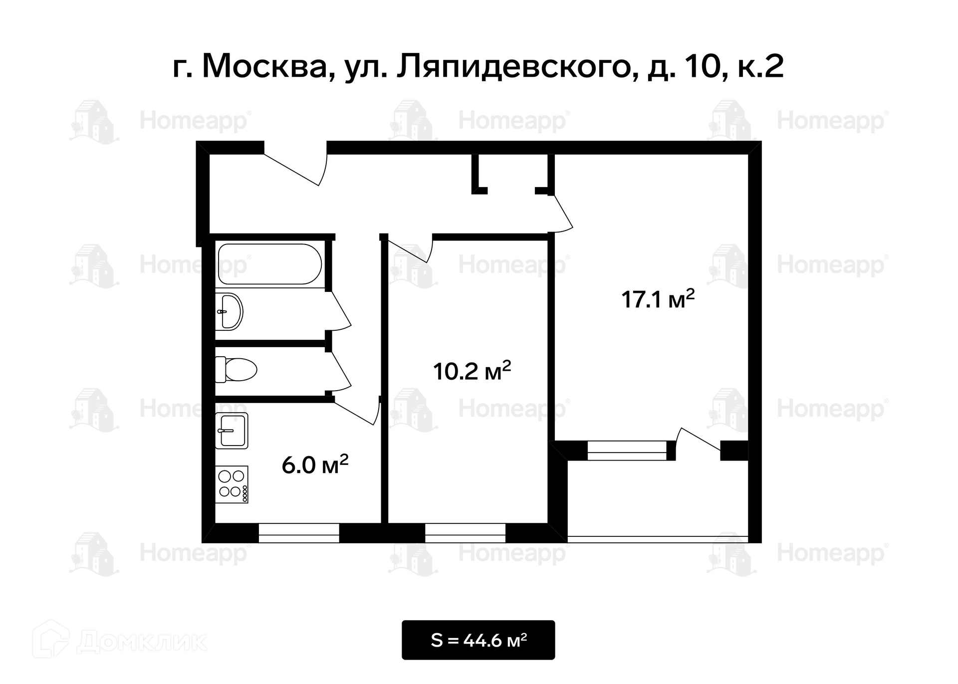 2-комнатная квартира, 44.6 м2, этаж 2 / 9, на продажу в Москве, улица Ляпидевского, 10к2