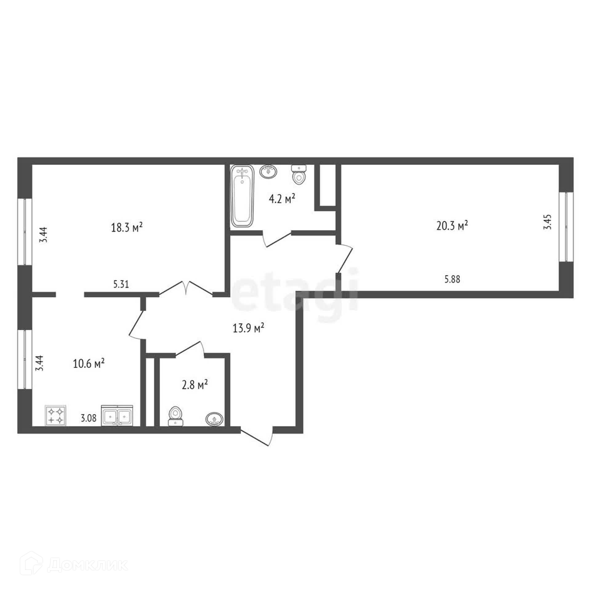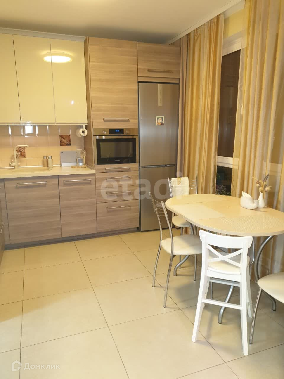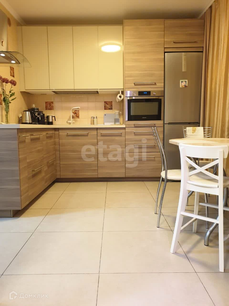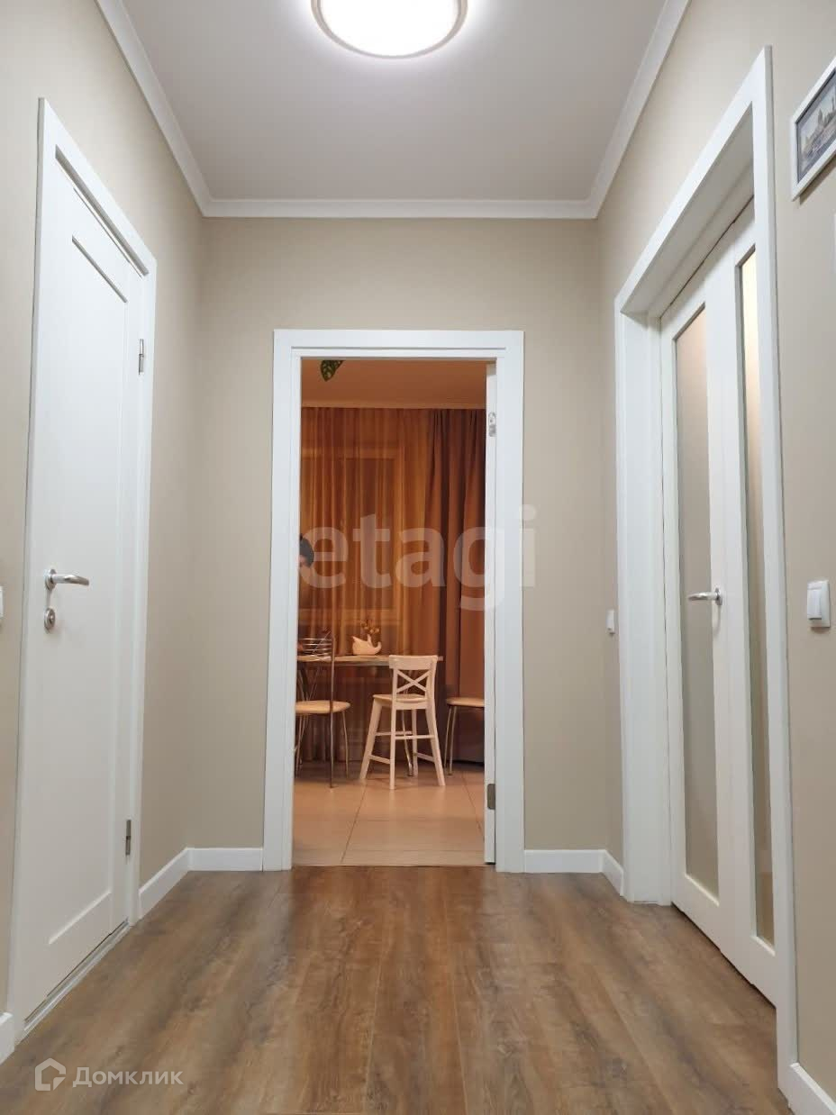 Просторная кухня 10 кв. м., гостиная 18 кв. м, спальня 20 кв. м., 2 санузла. Квартира продается с встроенной мебелью и техникой. На этаже есть колясочная.