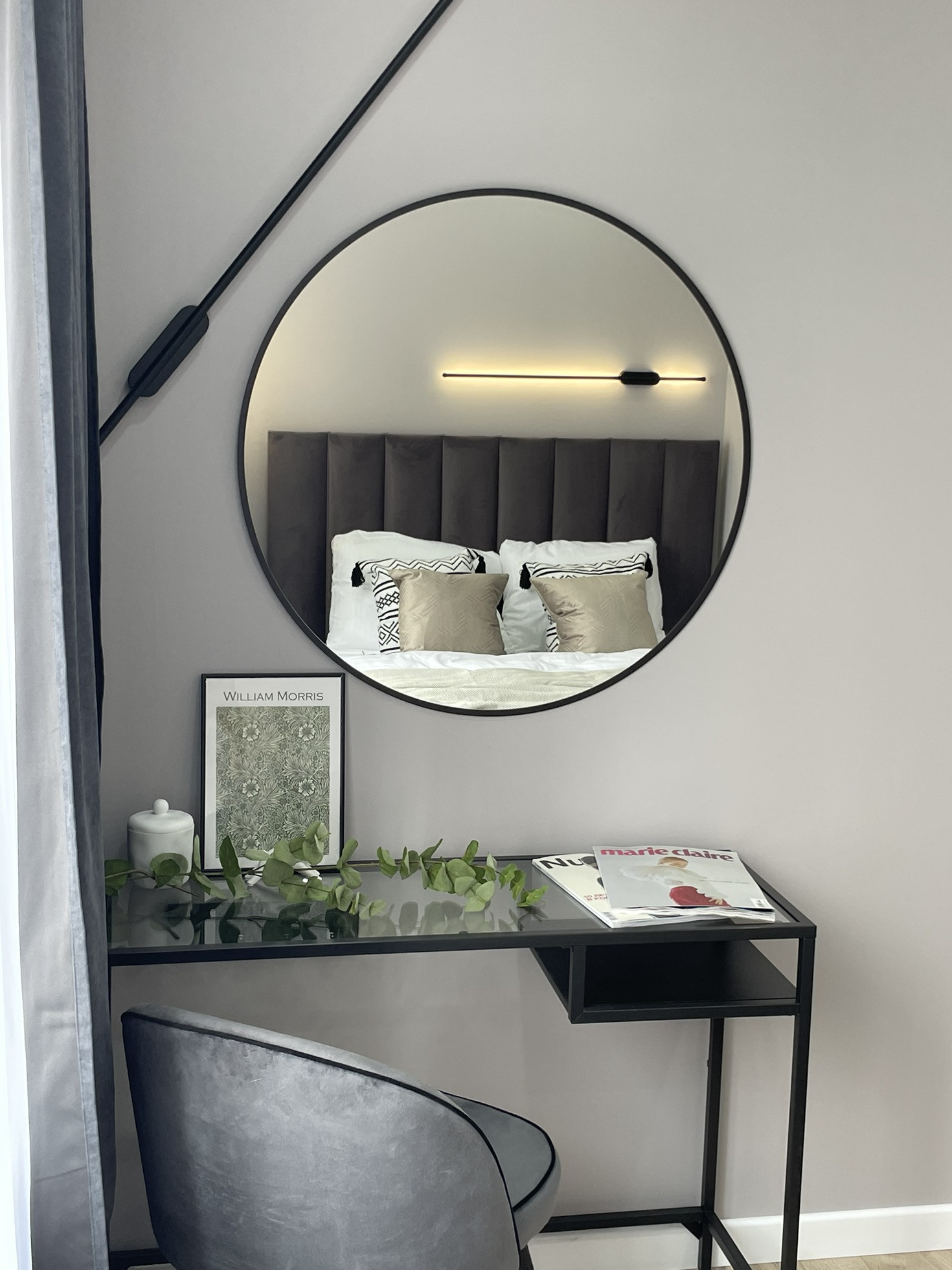 Изолированная спальня с рабочим местом, большой кроватью с подьемным механизмом для дополнительного хранения.