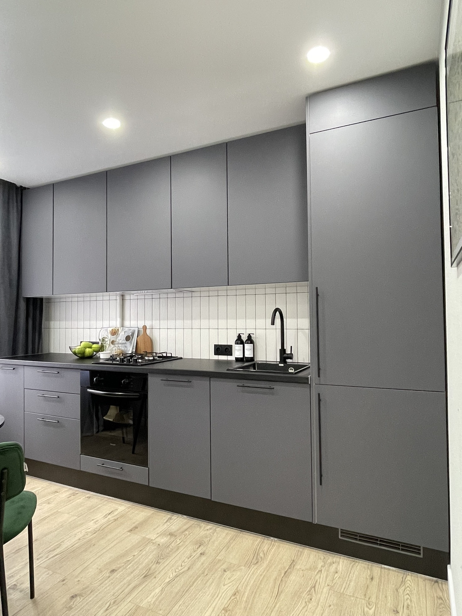 Просторная кухня со встроенной техникой: посудомоечной машиной, холодильником, духовым шкафом, вытяжкой и плитой — идеальна для уютных домашних вечеров.