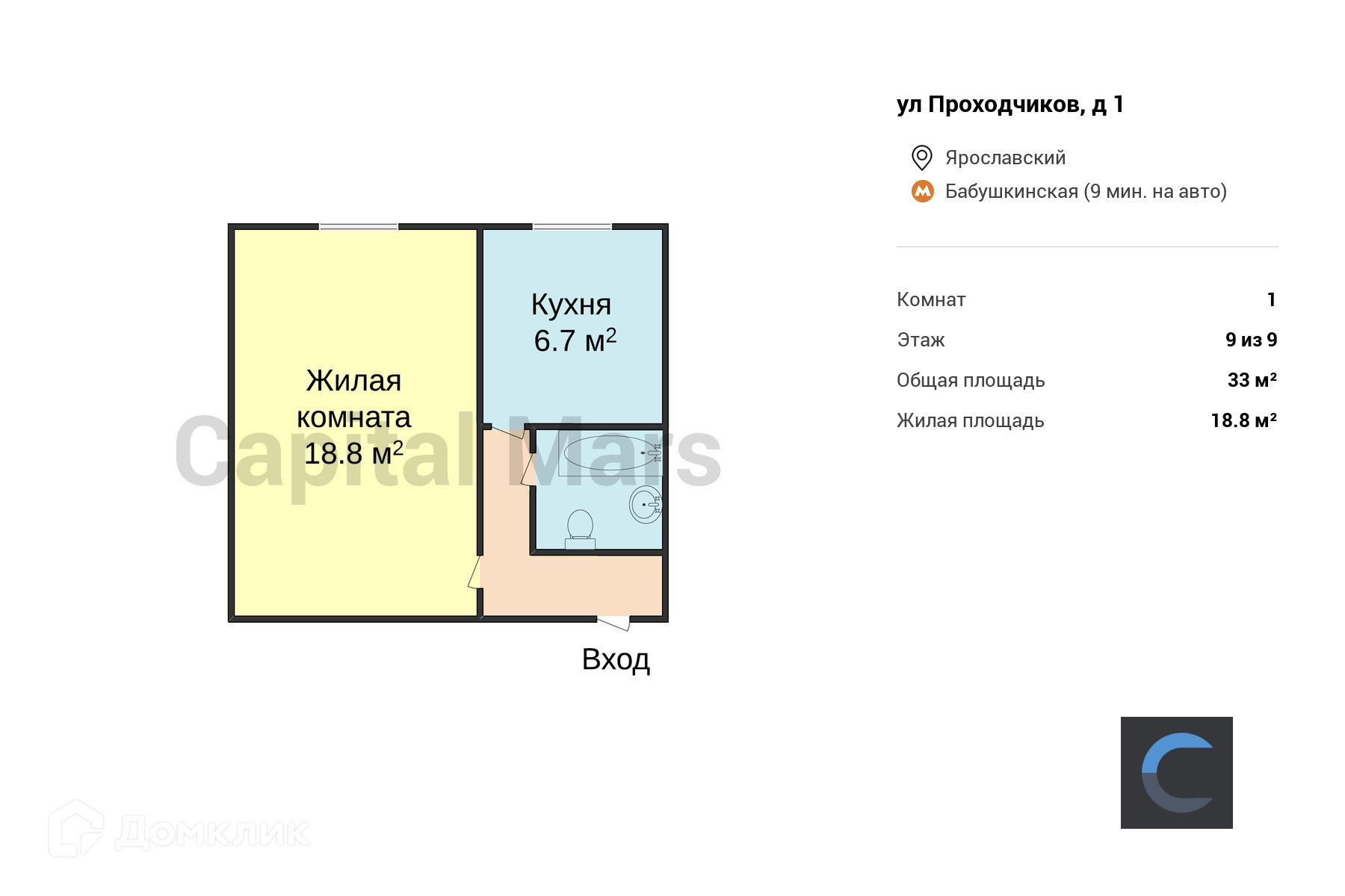 1-комнатная квартира, 33 м2, этаж 9 / 9, на продажу в Москве, улица Проходчиков, 1