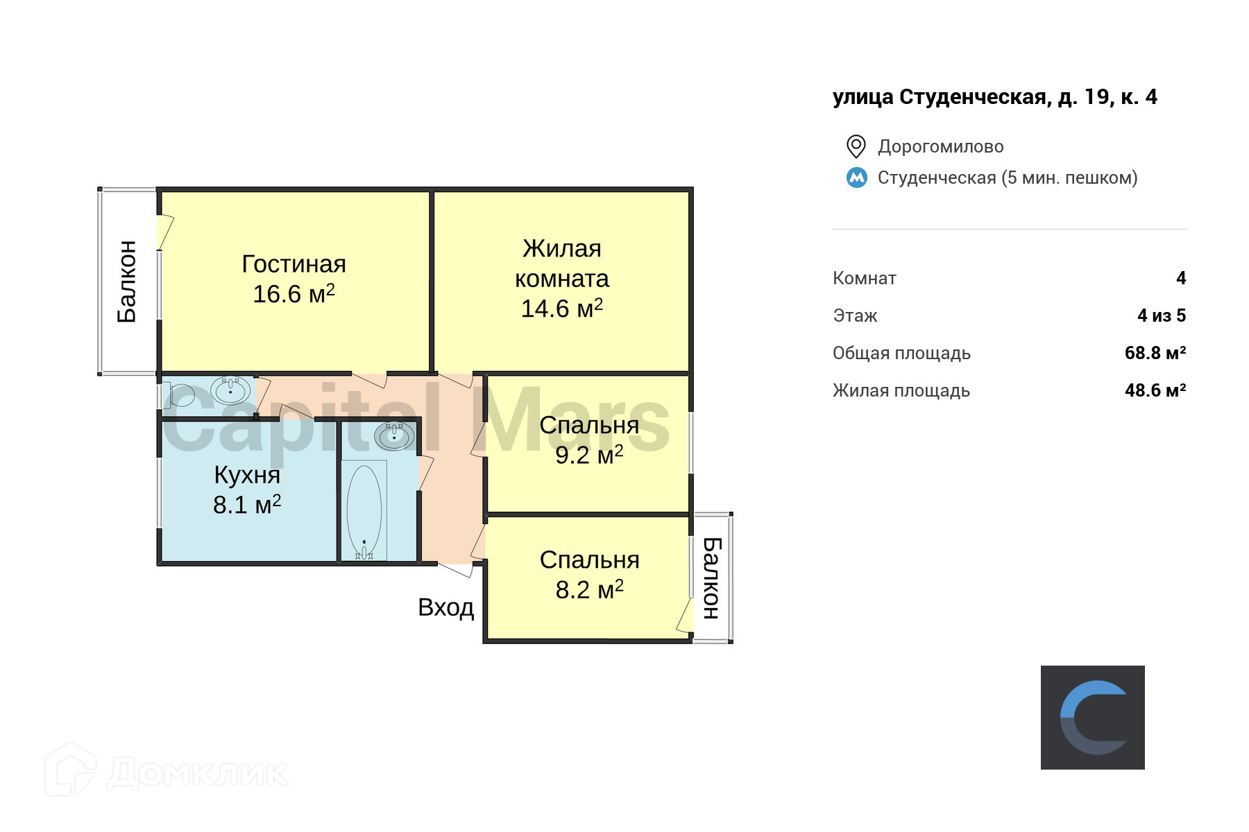 4-комнатная квартира, 68.8 м2, этаж 4 / 5, на продажу в Москве, Студенческая улица, 19к4