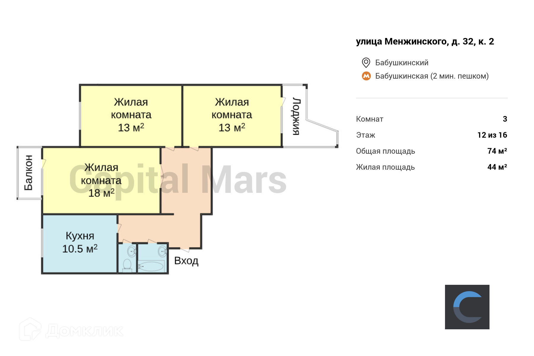 3-комнатная квартира, 74 м2, этаж 12 / 16, на продажу в Москве, улица Менжинского, 32к2