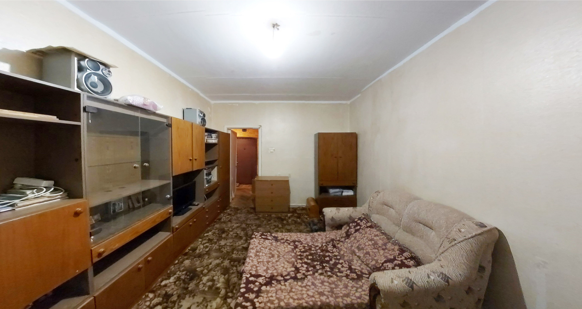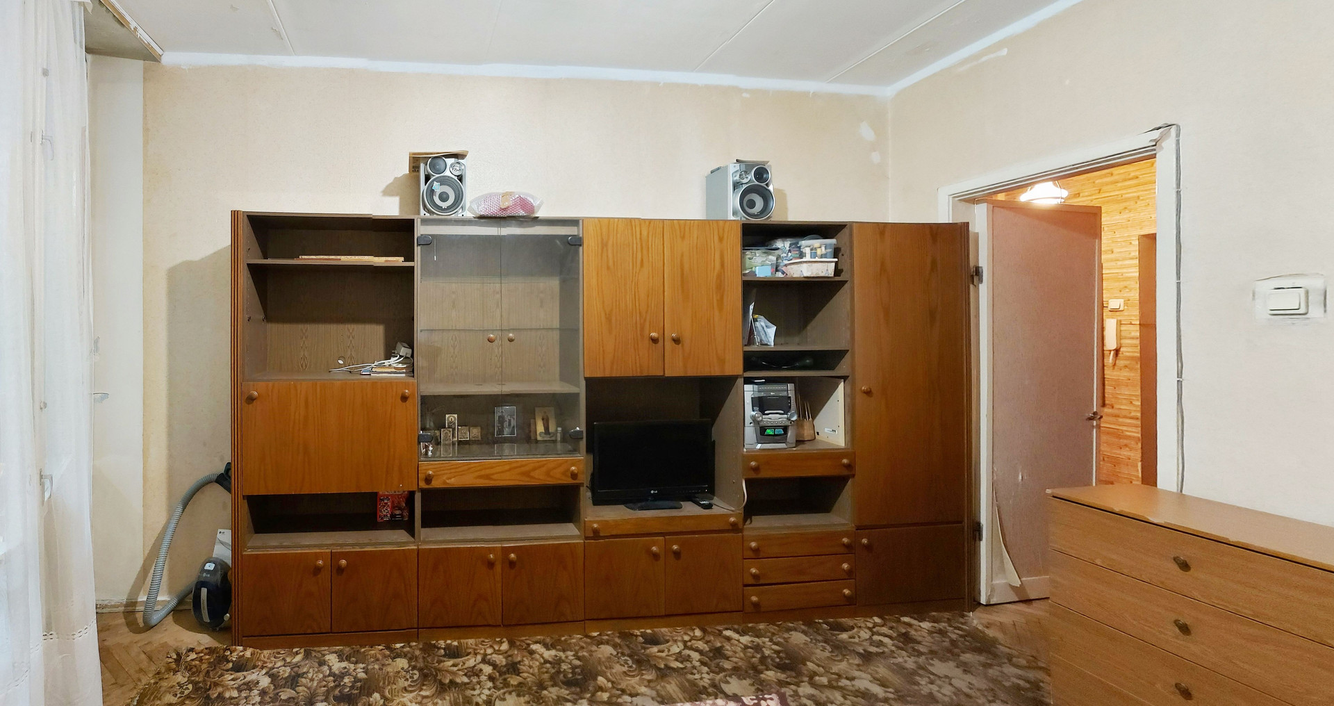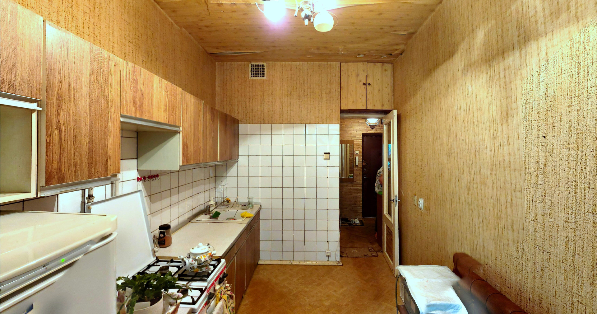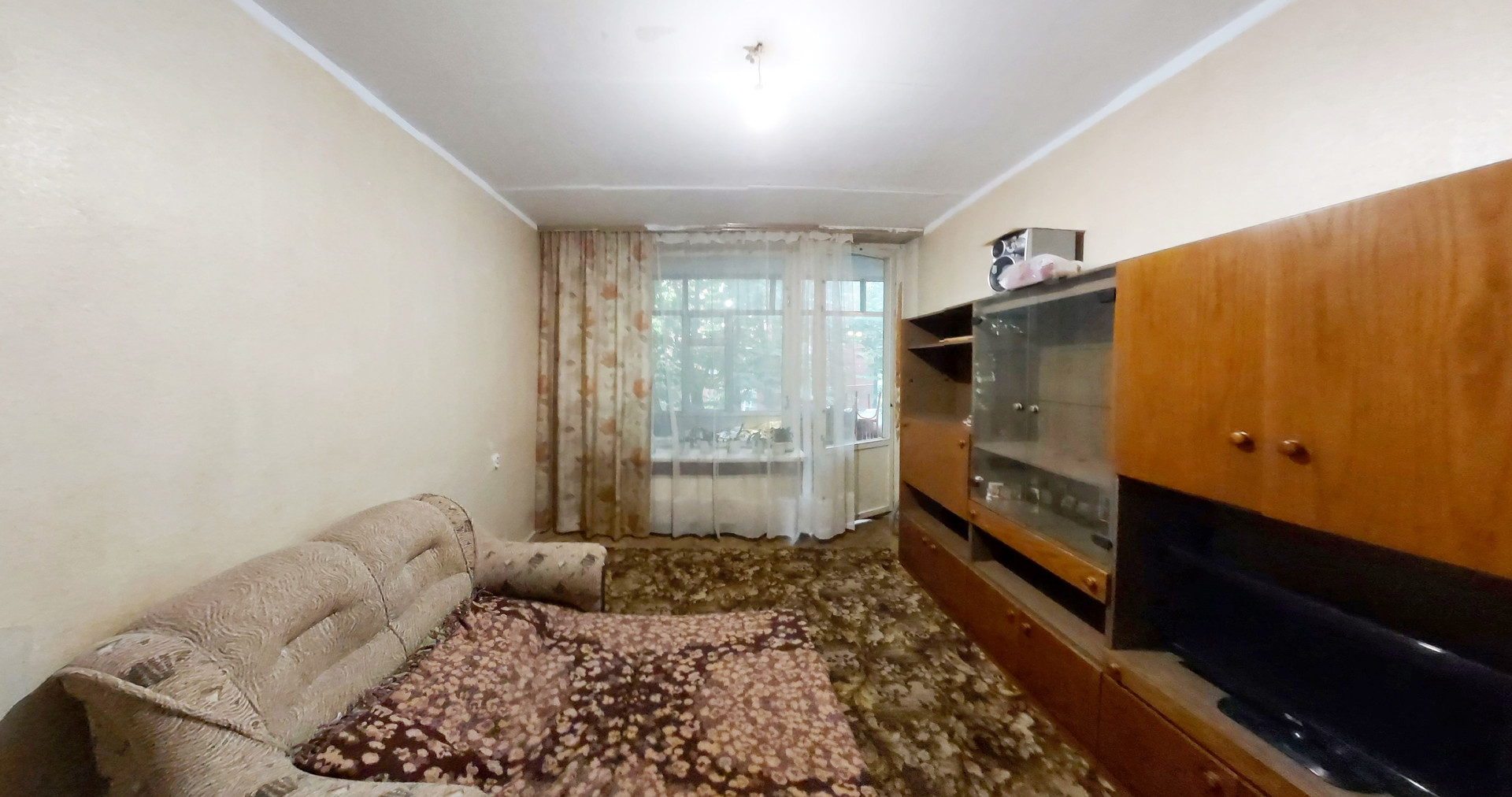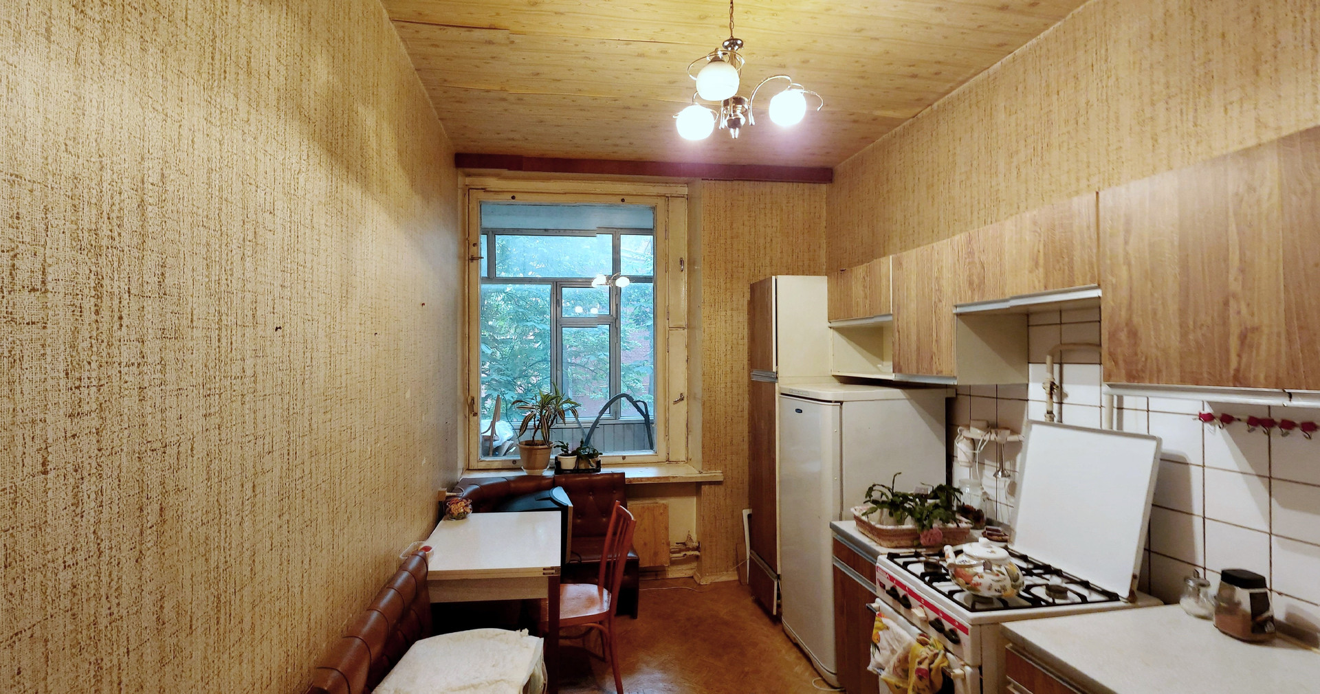 Средний ремонт, пол – «родной» паркет, С/У разд., ванная 3,3 кв.м., туалет 1,4 кв.м., коридор 4,5 кв.м., кладовая 0,6 кв.м., большая застеклённая лоджия из комнаты 7,9 кв.м. (не входит в площадь по ЕГРН 34,4 кв.м.), проходит через большую комнату и кухню, высокие потолки 3,0 м., линейка, окна в тихий двор. Квартира не торцевая, не угловая, зимой очень тепло. Кухонный гарнитур, плита газовая, встроенные «родные» шкафы, антресоли, мебель в комнатах.
