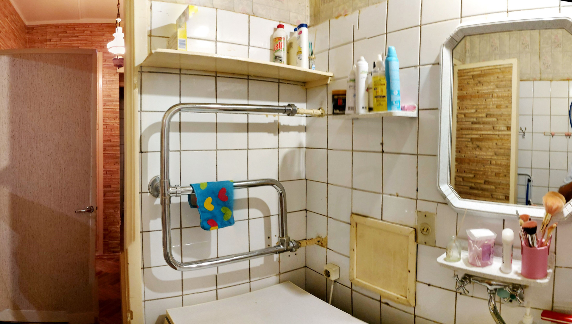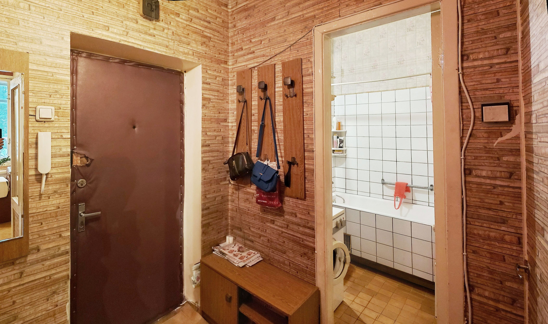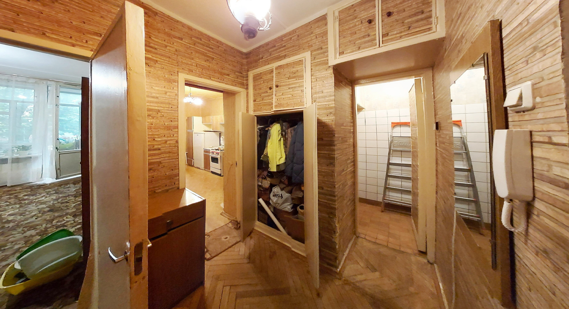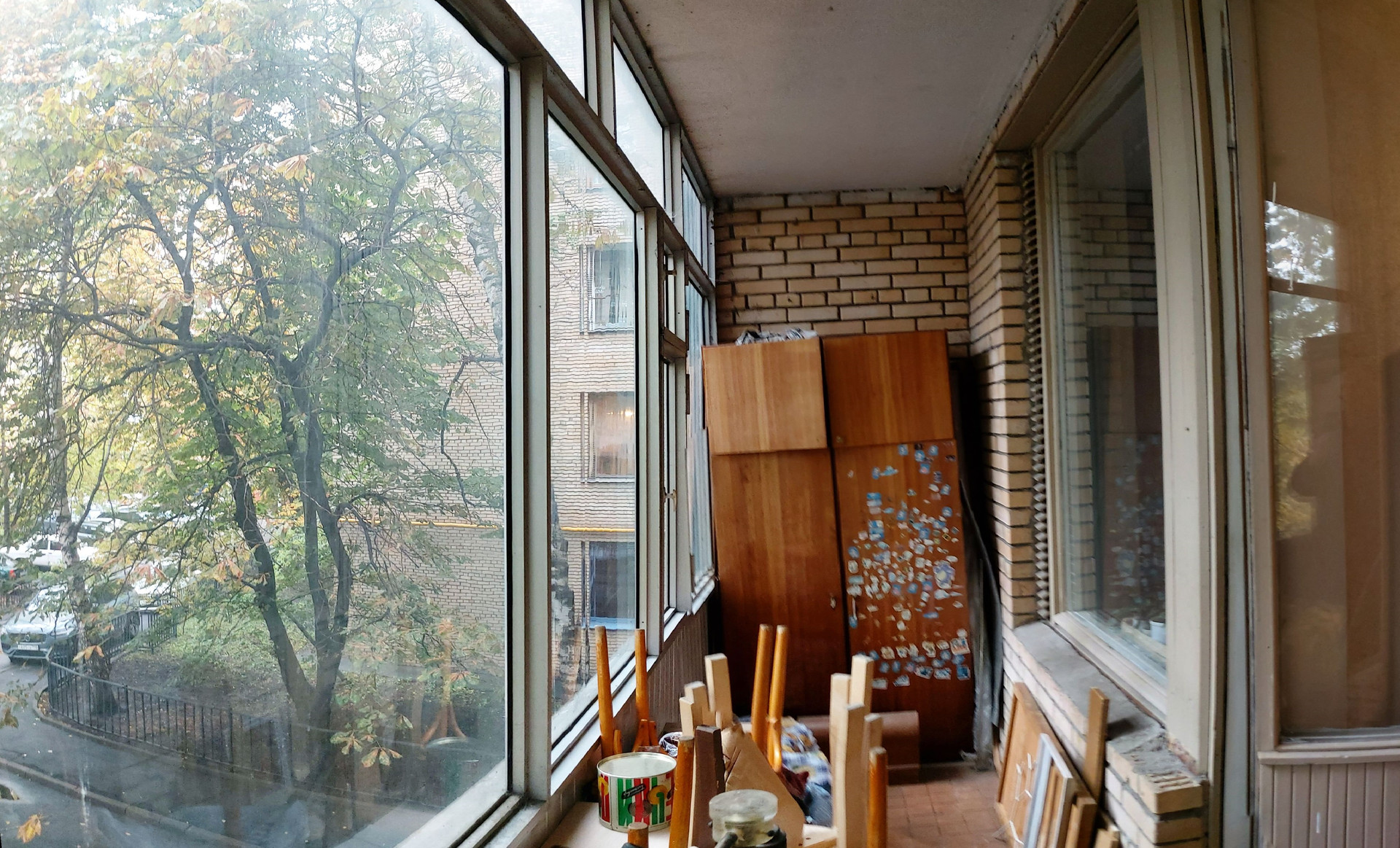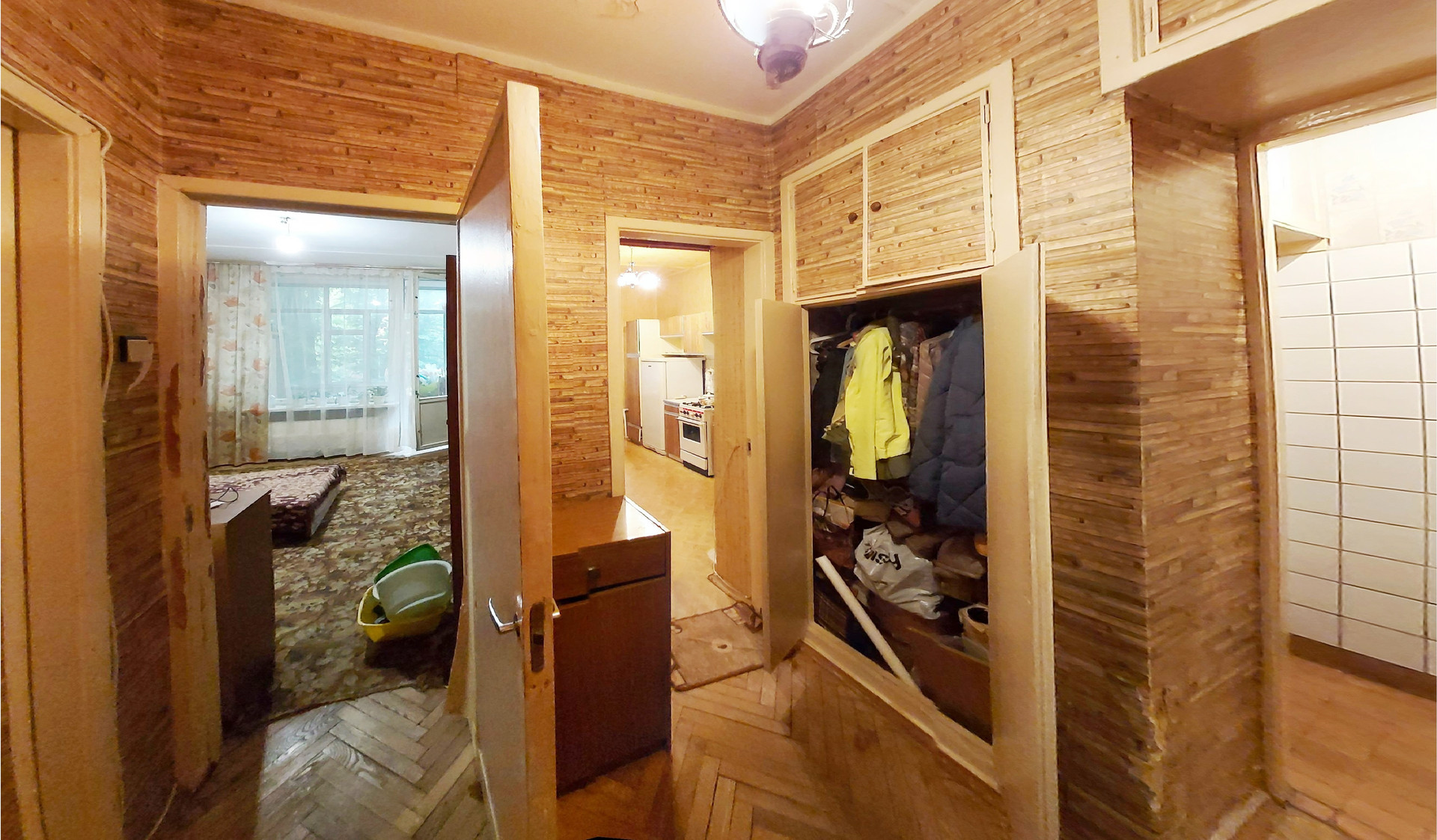 Средний ремонт, пол – «родной» паркет, С/У разд., ванная 3,3 кв.м., туалет 1,4 кв.м., коридор 4,5 кв.м., кладовая 0,6 кв.м., большая застеклённая лоджия из комнаты 7,9 кв.м. (не входит в площадь по ЕГРН 34,4 кв.м.), проходит через большую комнату и кухню, высокие потолки 3,0 м., линейка, окна в тихий двор. Квартира не торцевая, не угловая, зимой очень тепло. Кухонный гарнитур, плита газовая, встроенные «родные» шкафы, антресоли, мебель в комнатах.