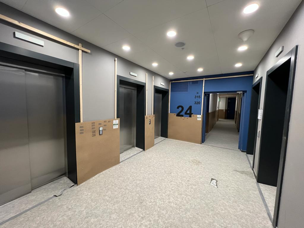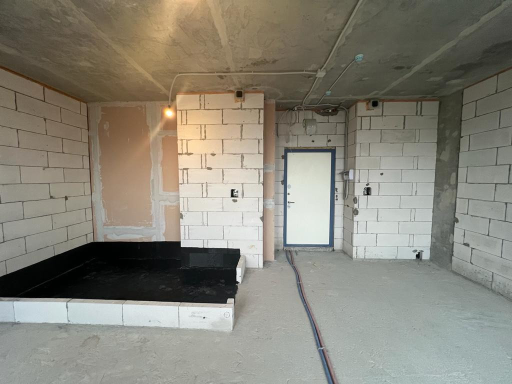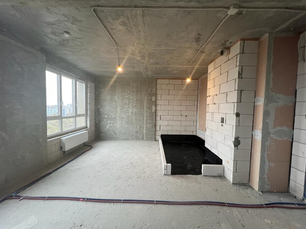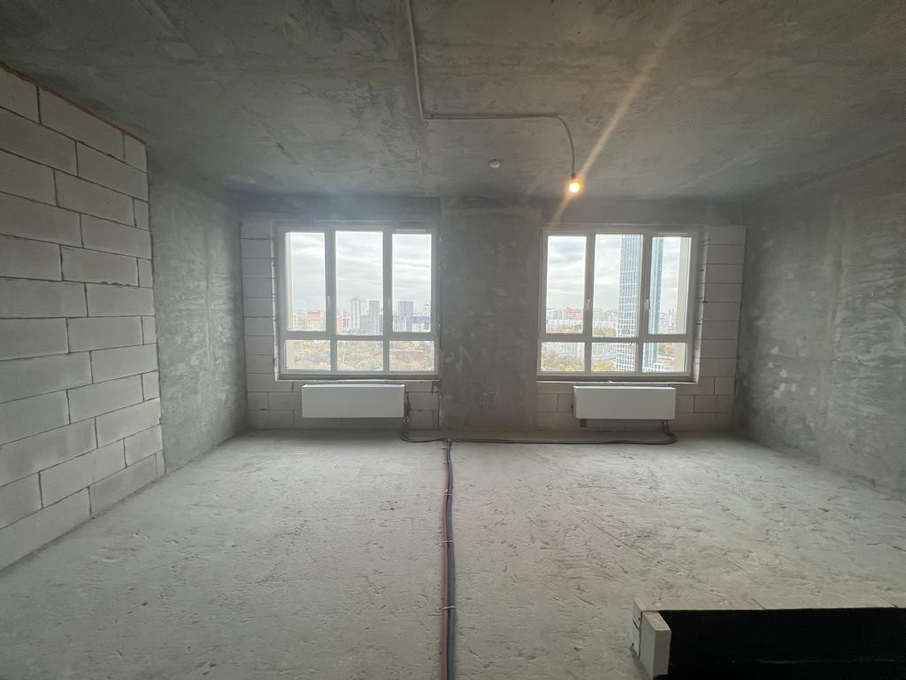 Просторная однокомнатная квартира без отделки в ЖК "Огни-2" на 24 этаже. Общая площадь: 33,7 кв.м.,  из которых 10 кв.м. выделено под кухонную зону. Все окна выходят на одну сторону. В квартире один совмещенный санузел. Высота потолков 3.1 м.