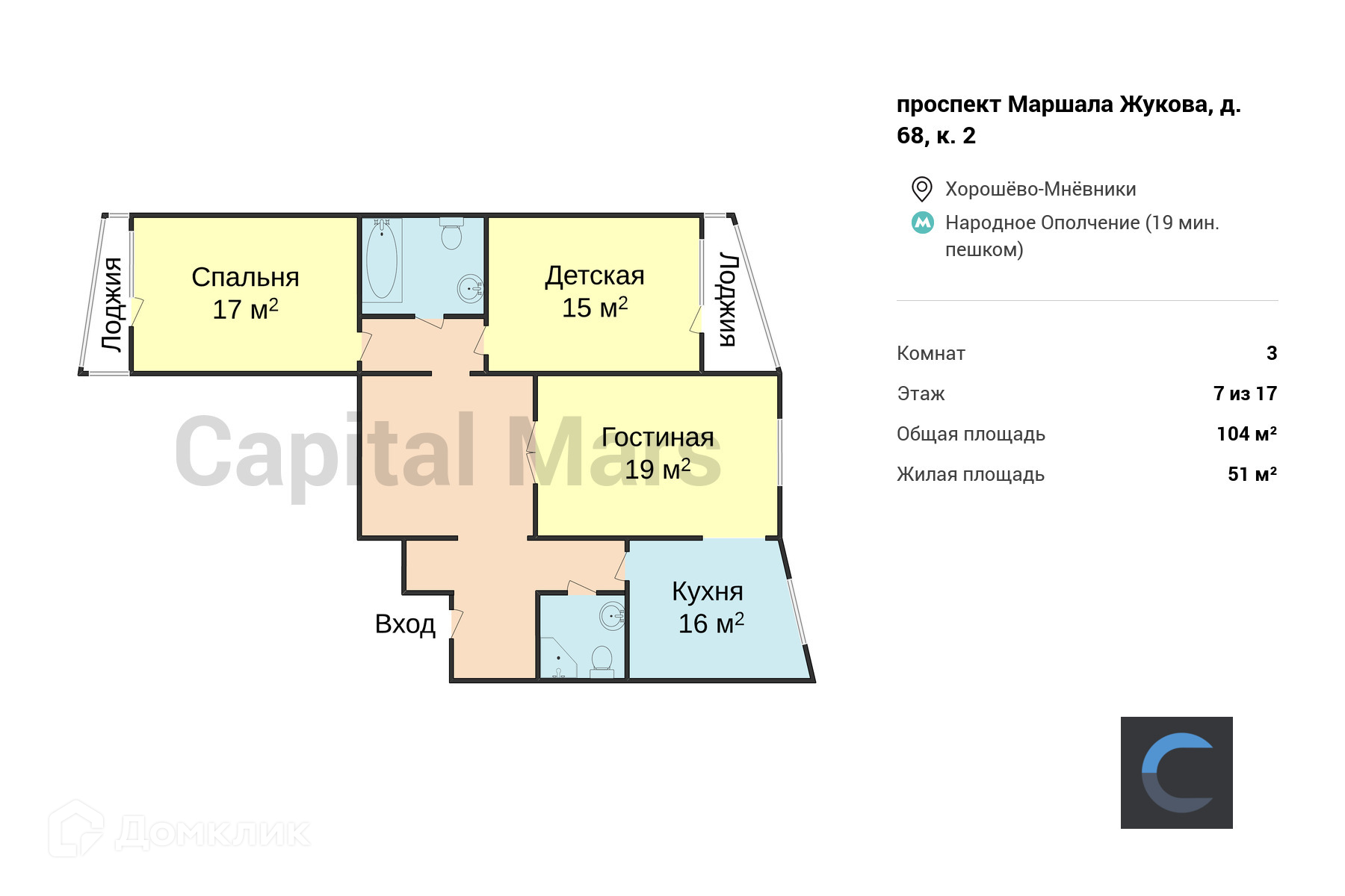 3-комнатная квартира, 104 м2, этаж 7 / 17, на продажу в Москве, проспект Маршала Жукова, 68к2