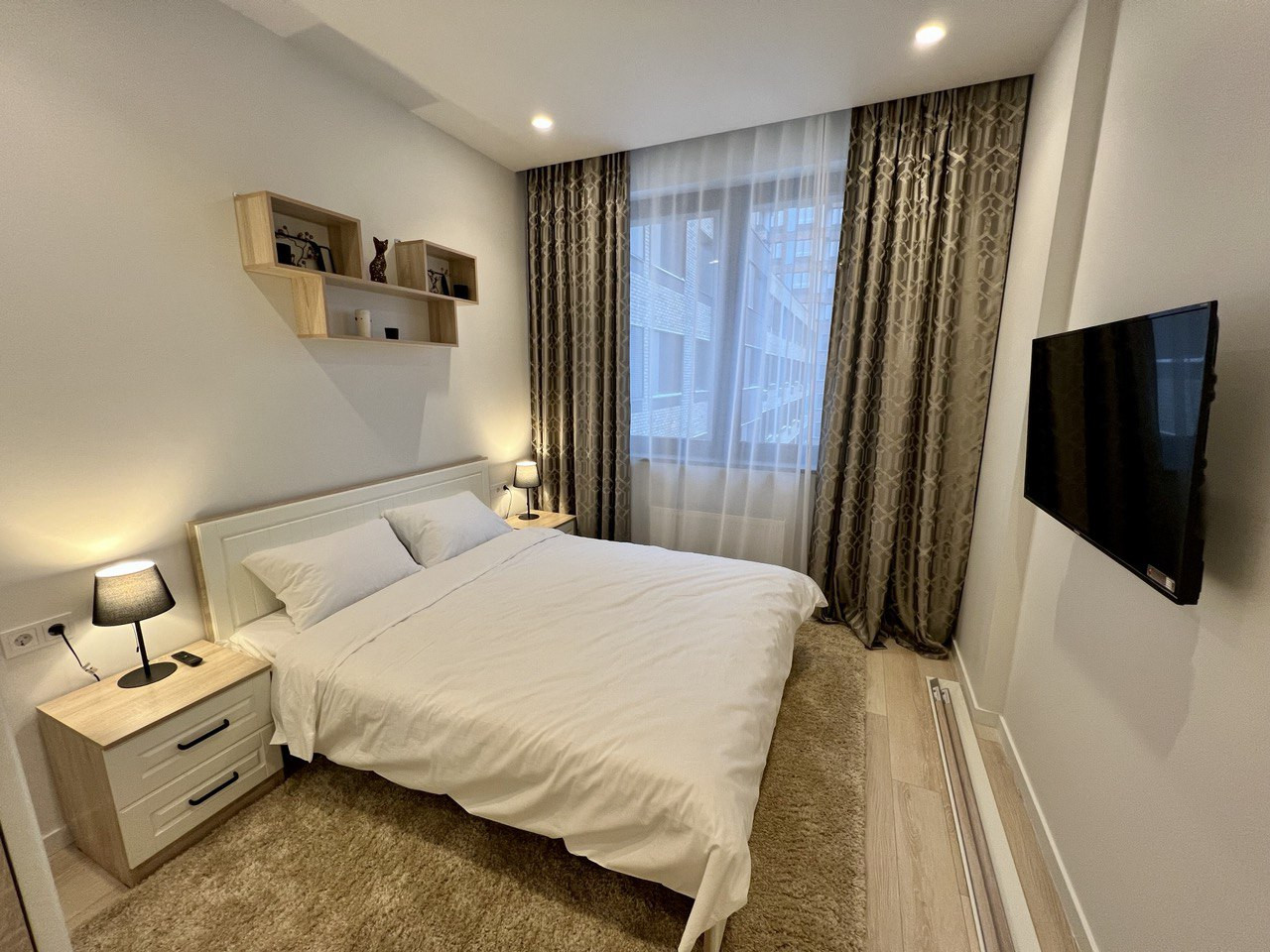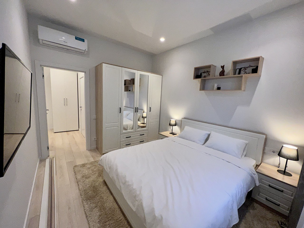 - Спальня: кровать евро, ортопедический матрас, прикроватные тумбы, многофункциональный шкаф, телевизор;