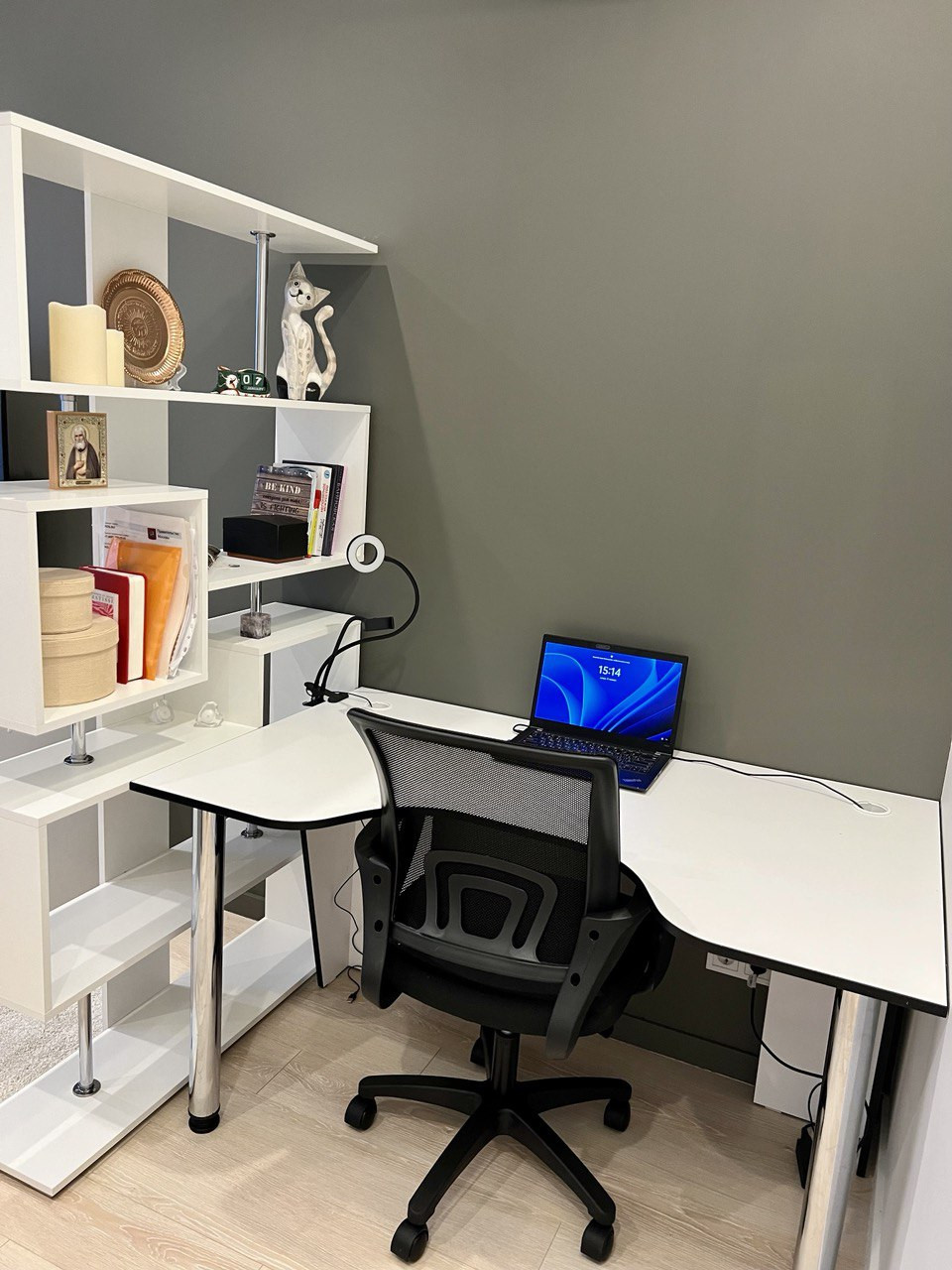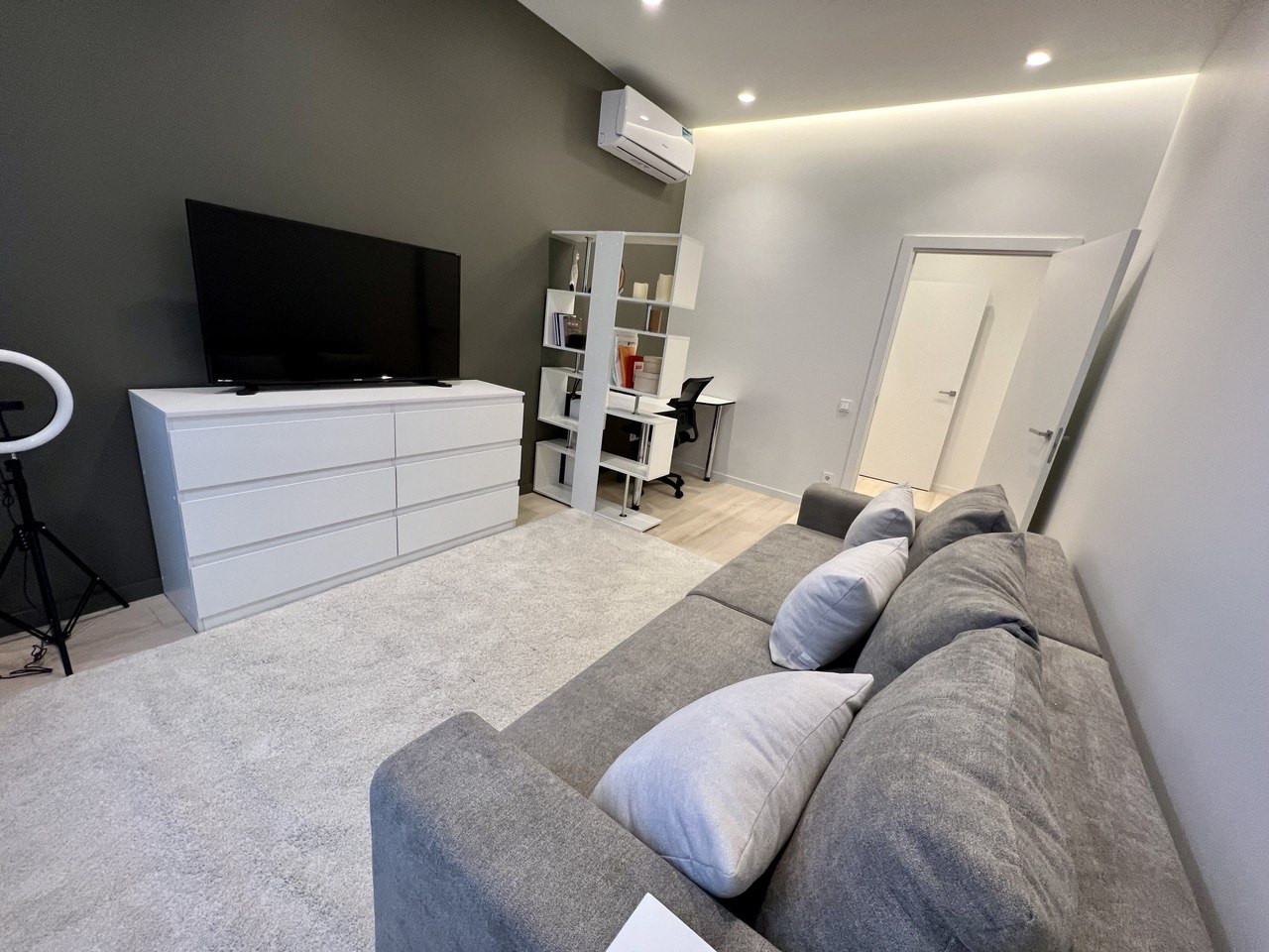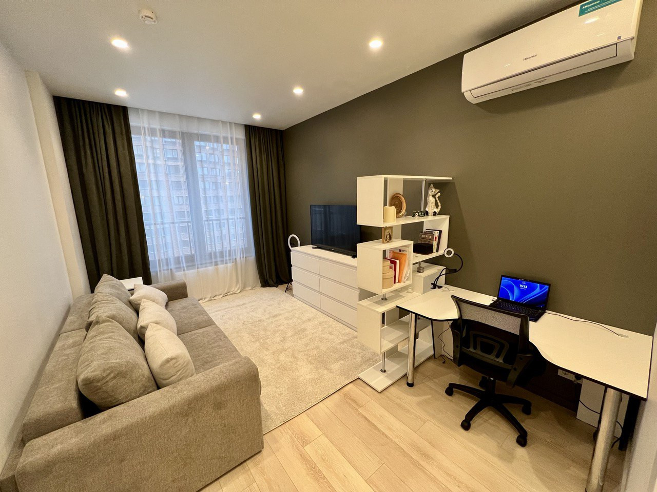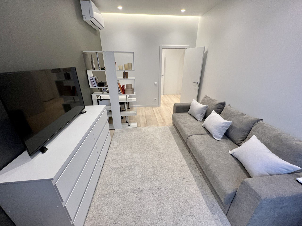 - Гостиная (может использоваться в качестве детской) разделена на рабочее место и зону отдыха: диван (раскладывается в двуспальный + матрас), комод, телевизор, компьютерный стол с креслом, стеллаж;
