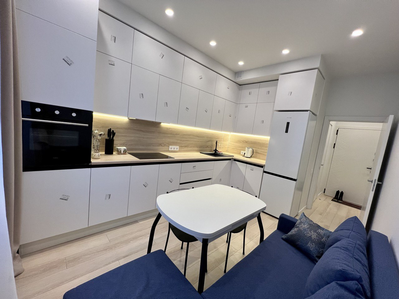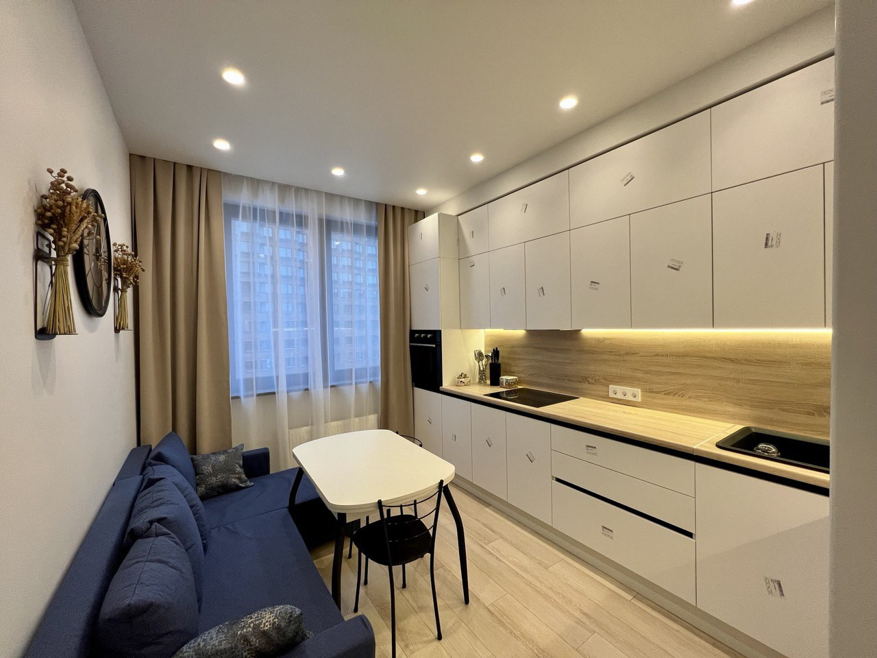 - Кухня большая, функциональная, (может использоваться как спальная и гостевая комната) встроенная техника, холодильник, духовой шкаф, стиральная машина, диван (раскладывается в двуспальный).