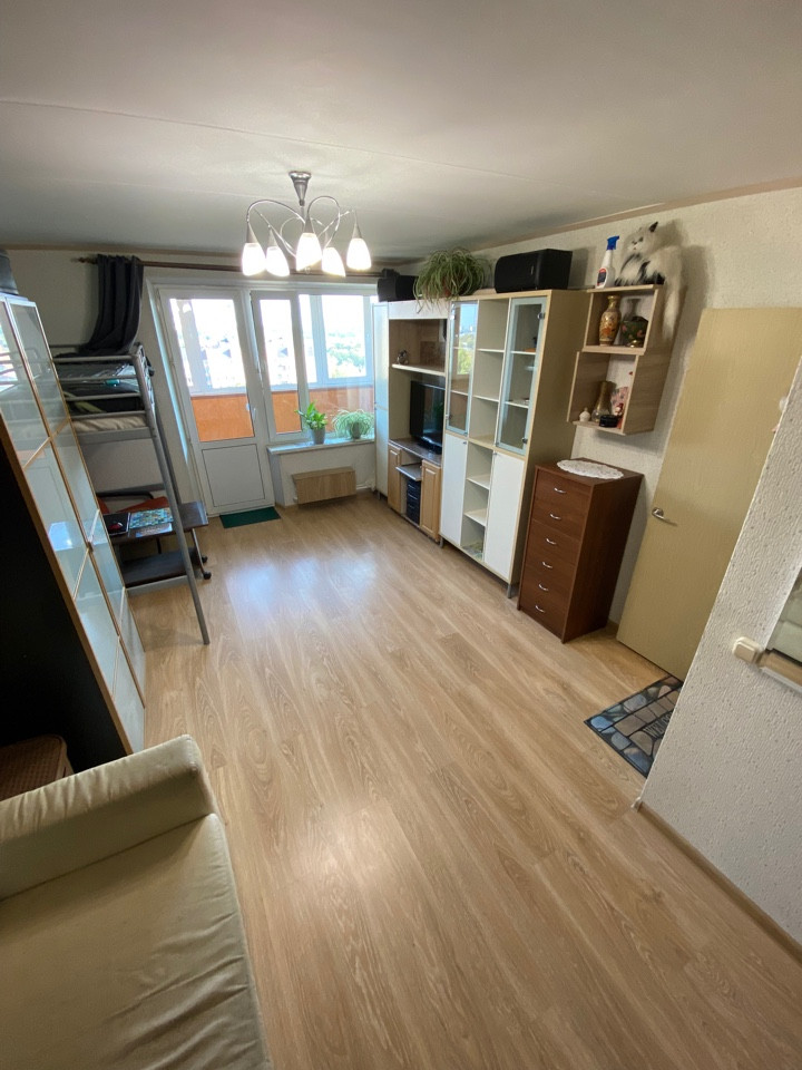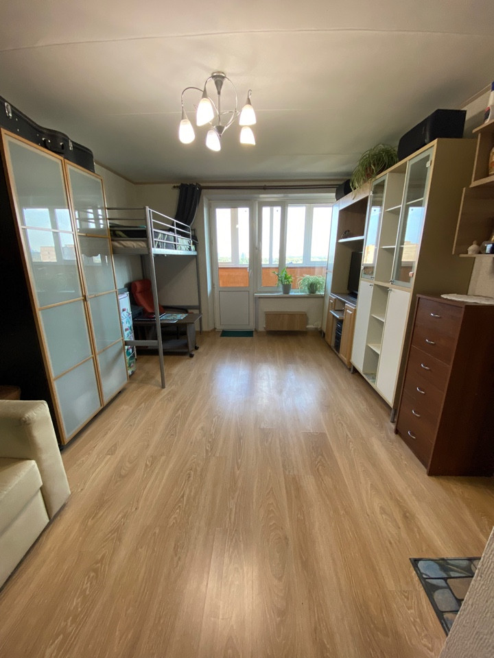 Квартира расположена на 14-м этаже, 16-ти этажного дома, общая площадь без лоджии 34.1 кв.м, комната 18,5 кв.м, кухня 9.9 кв.м, просторная лоджия 6.2 кв.м (лоджия утеплена с гидроизоляцией), совмещенный санузел, полы покрыты ламинатом, а в санузле уложена плитка.