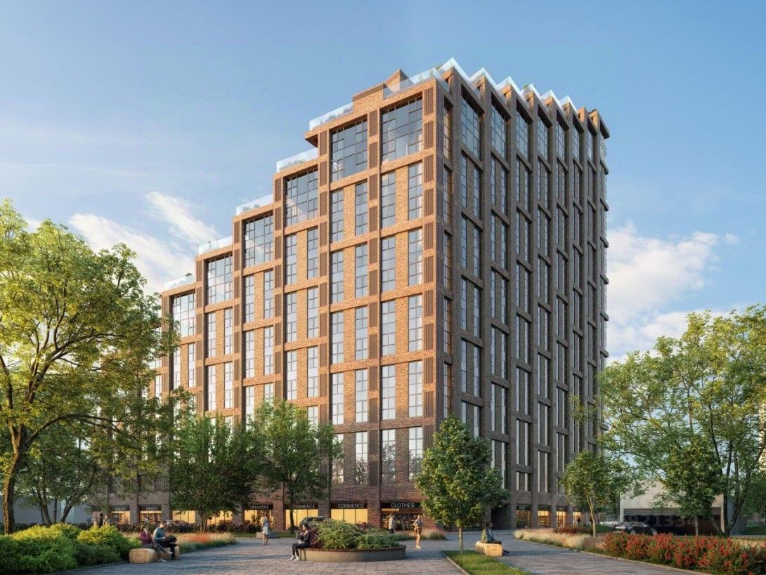 Фасад облицован клинкерным кирпичом теплого красно-коричневого оттенка. Авторская архитектура подчеркивает ритм мегаполиса, верхние этажи спроектированы каскадом, позволяя обустроить летние пространства на каждой из "ступенек".