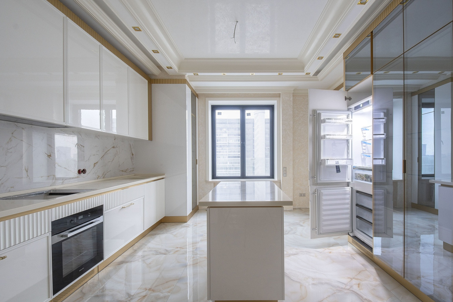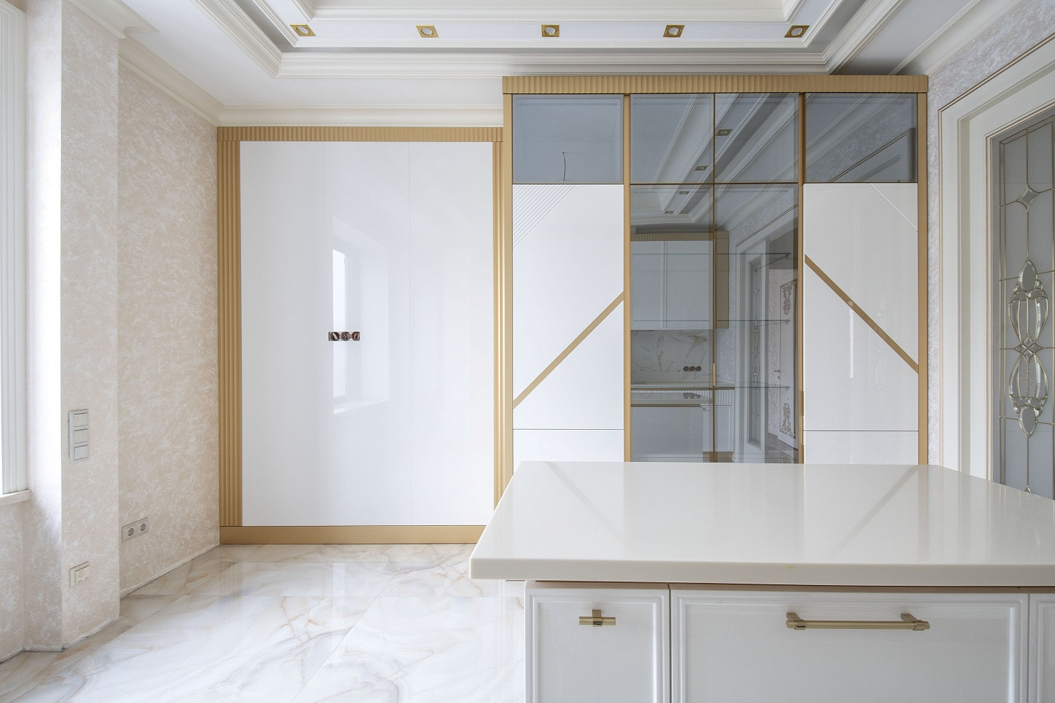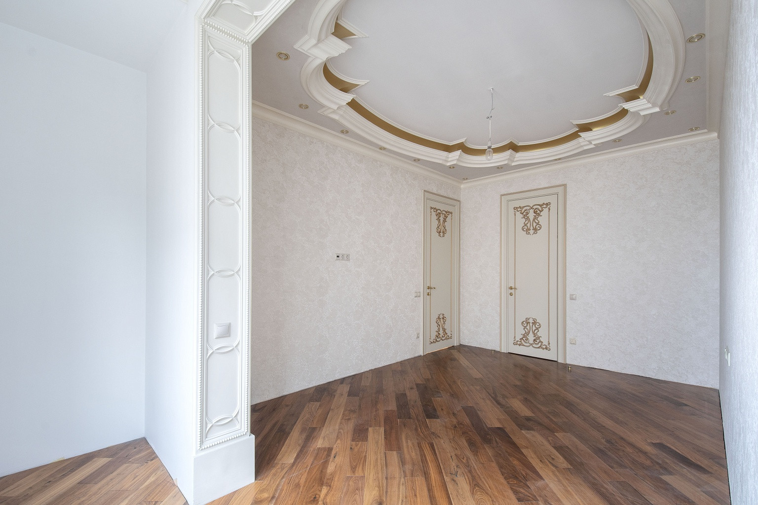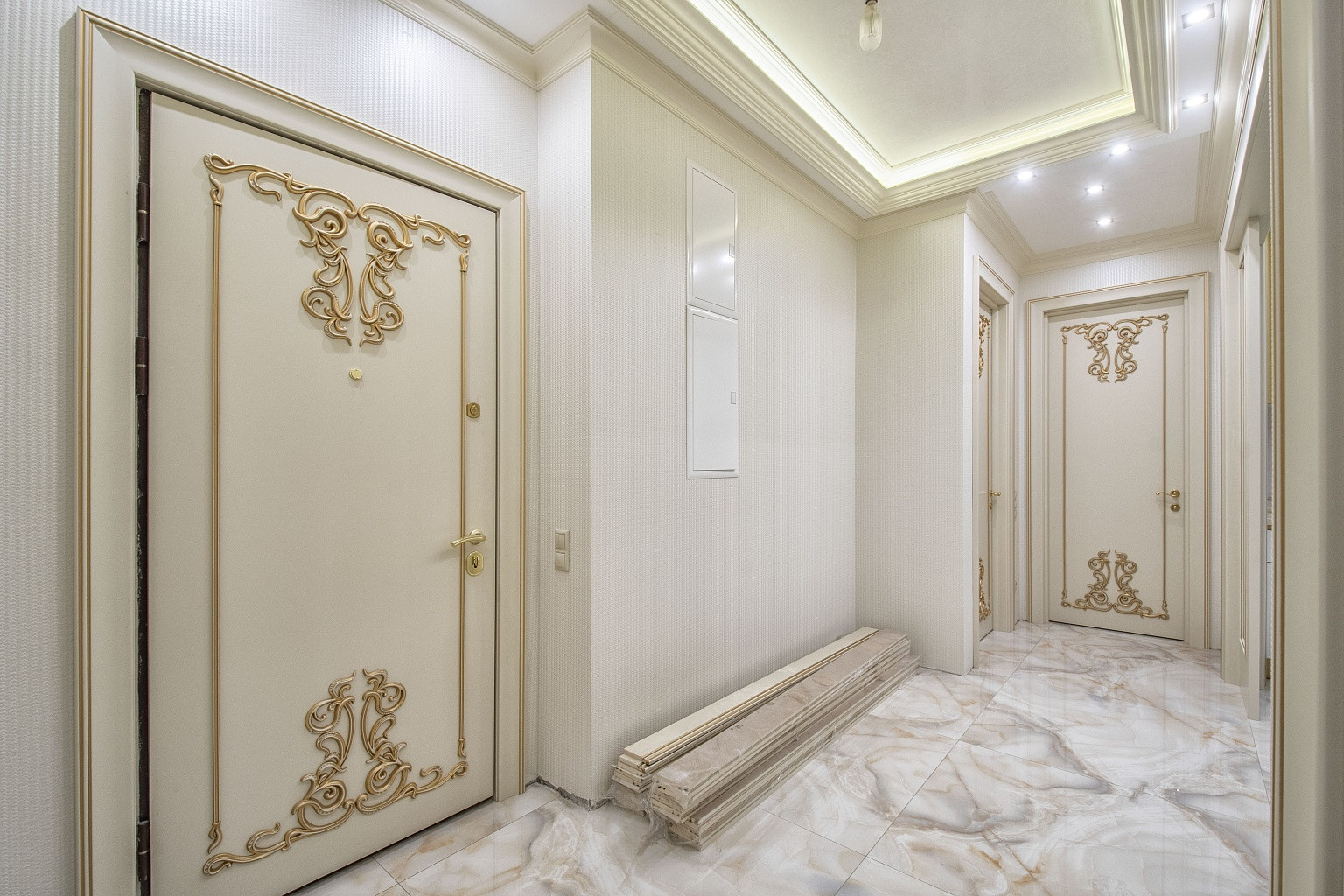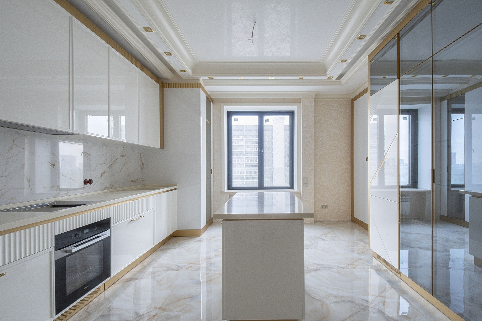 В комнатах уложена паркетная доска, стены оклеены неубиваемыми обоями Lamborghini. В спальнях организованы ниши под места для хранения вещей. В кухне, коридоре и санузлах напольная плитка Versace и Cavalli. Кухонный гарнитур Giulia Novars итальянского производства, стоимостью 4000 евро, со столешницей и островом из искусственного камня. Техника Miele и SMEG, два холодильника LIEBHERR. Сантехника GEBERIT.