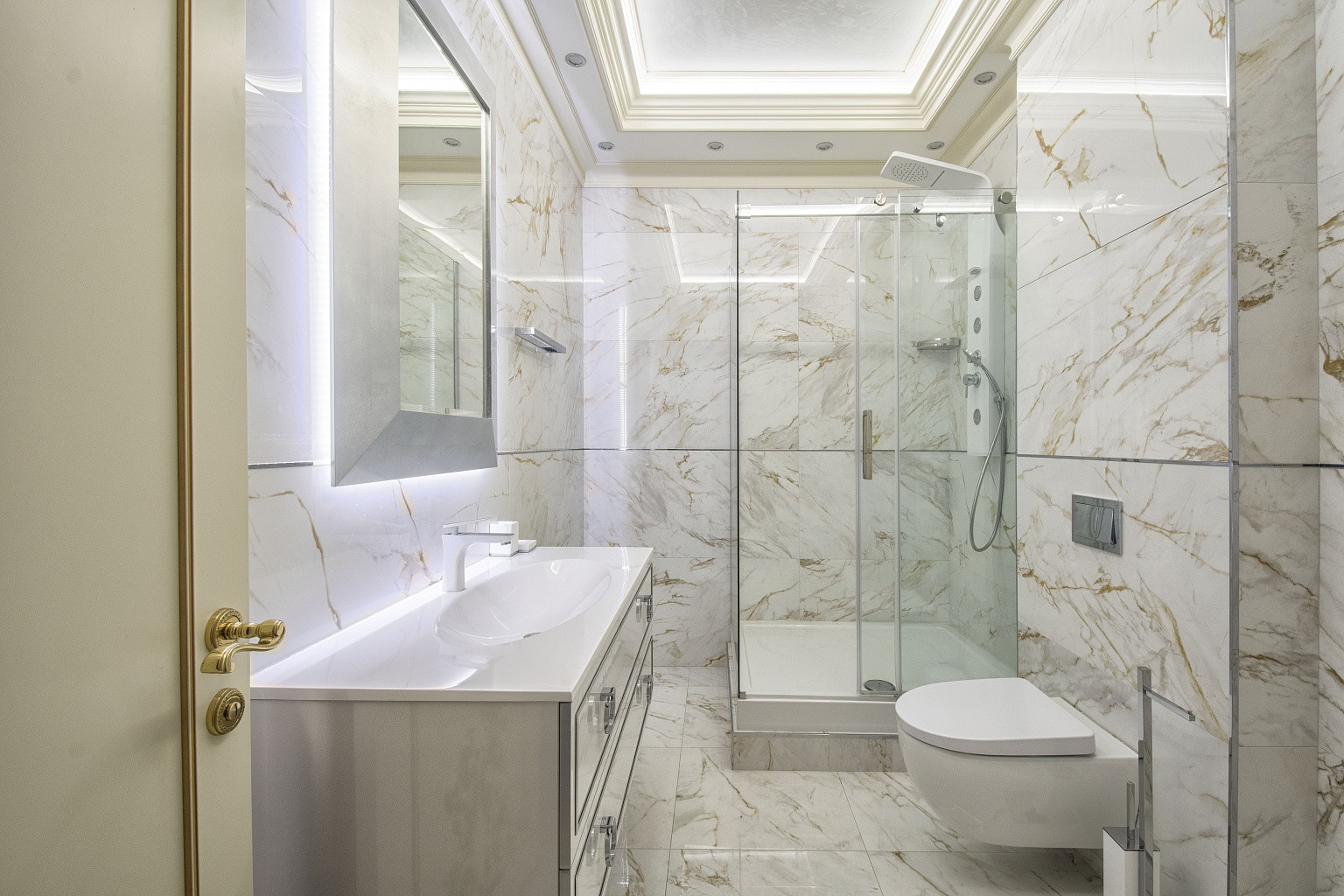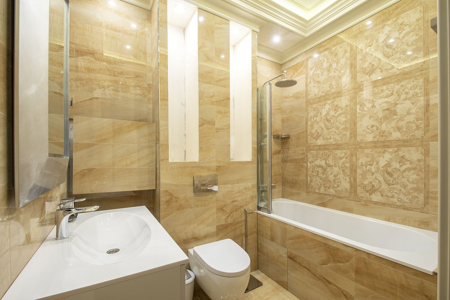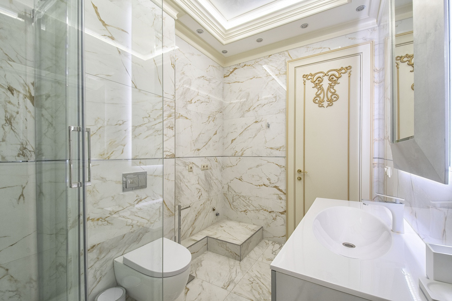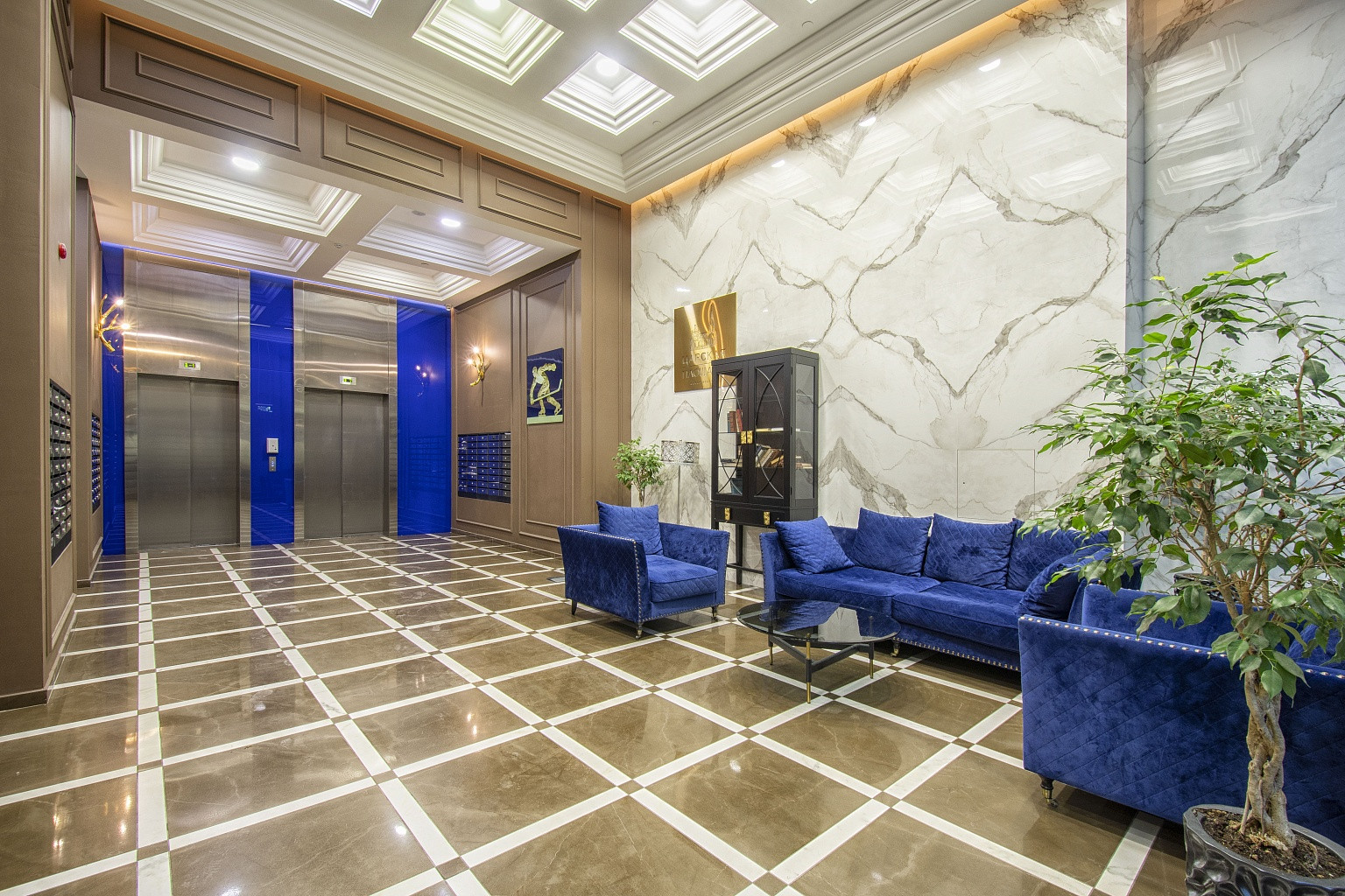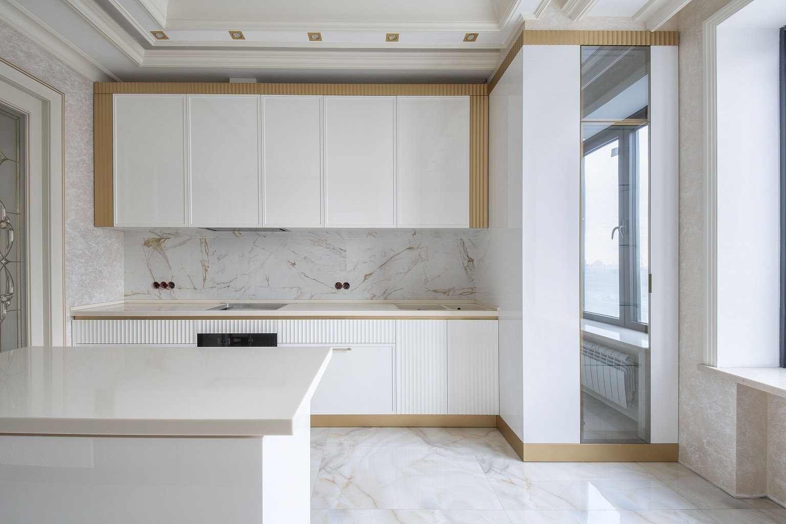 В комнатах уложена паркетная доска, стены оклеены неубиваемыми обоями Lamborghini. В спальнях организованы ниши под места для хранения вещей. В кухне, коридоре и санузлах напольная плитка Versace и Cavalli. Кухонный гарнитур Giulia Novars итальянского производства, стоимостью 4000 евро, со столешницей и островом из искусственного камня. Техника Miele и SMEG, два холодильника LIEBHERR. Сантехника GEBERIT.