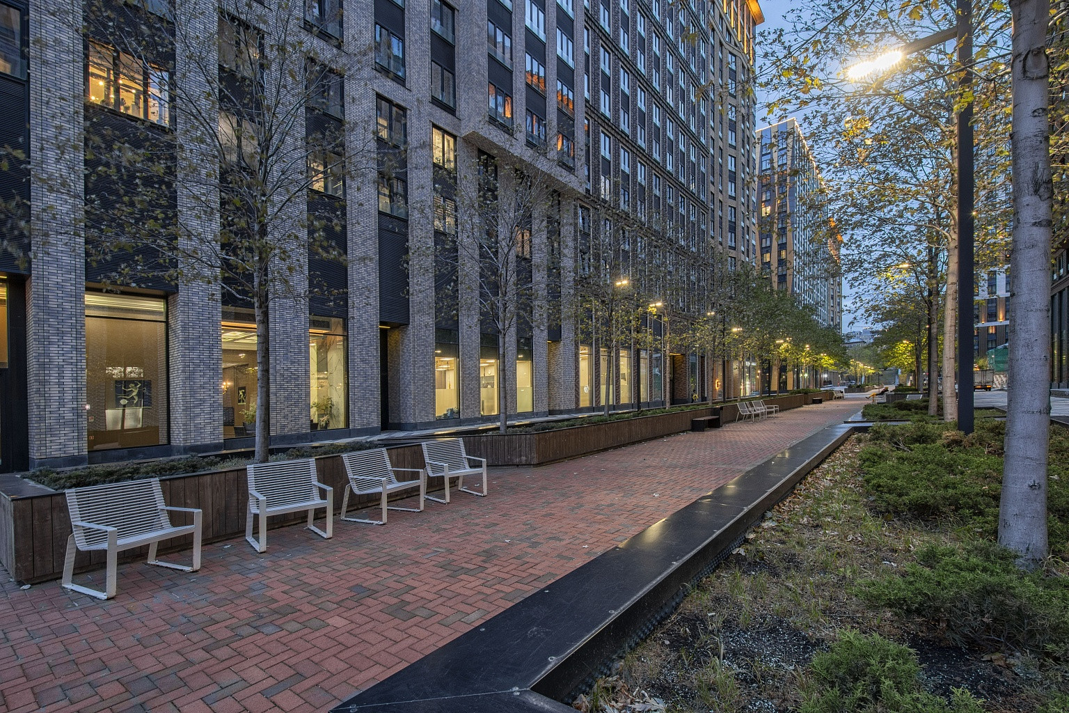На территории жилого комплекса создана зона отдыха с пешеходной галереей. Для автомобилей есть подземная парковка, реализована концепция «двор без машин».