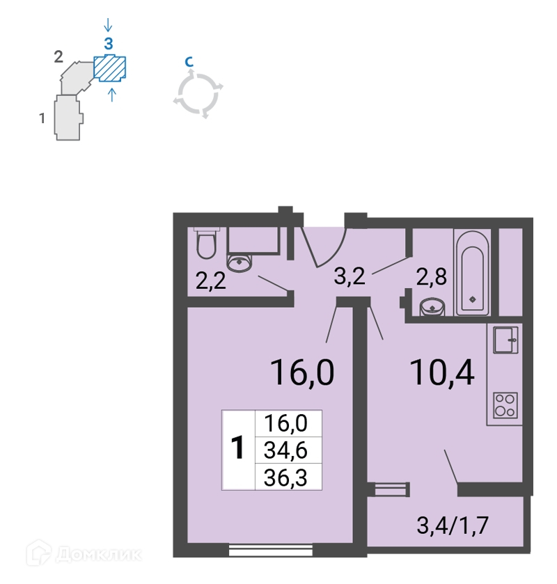Общая площадь 36.3 м2
