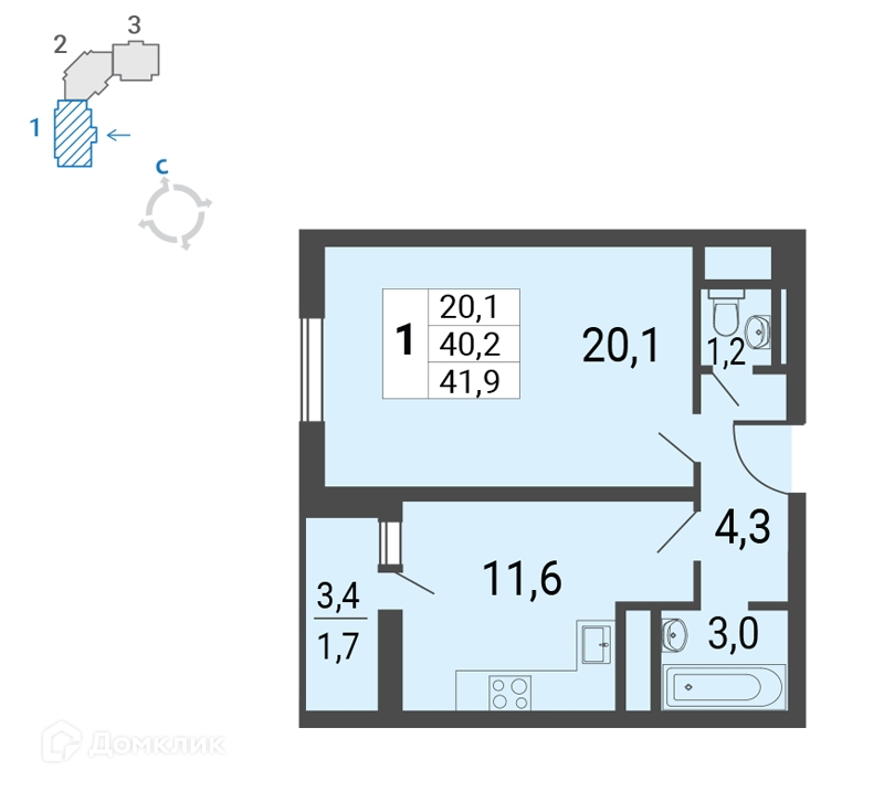 Общая площадь 41.9 м2