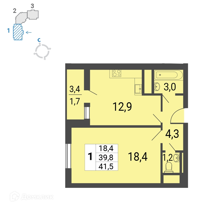 Общая площадь 41.5 м2