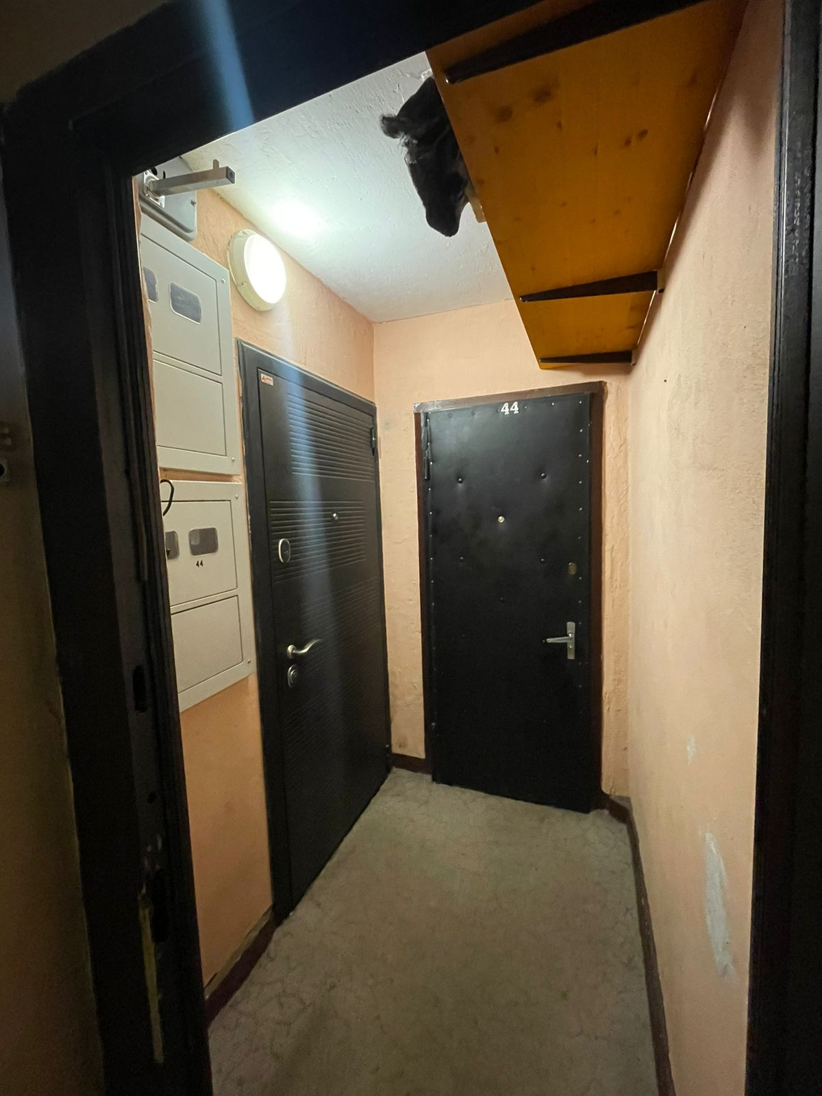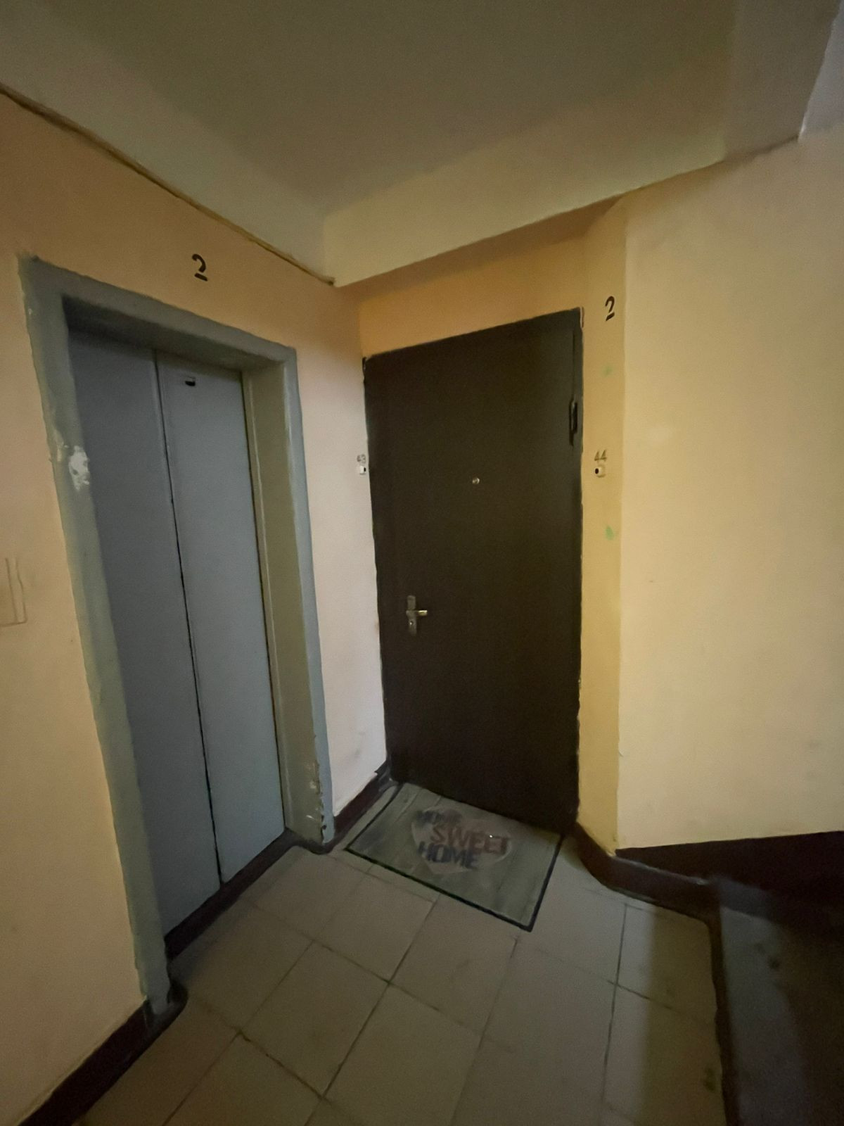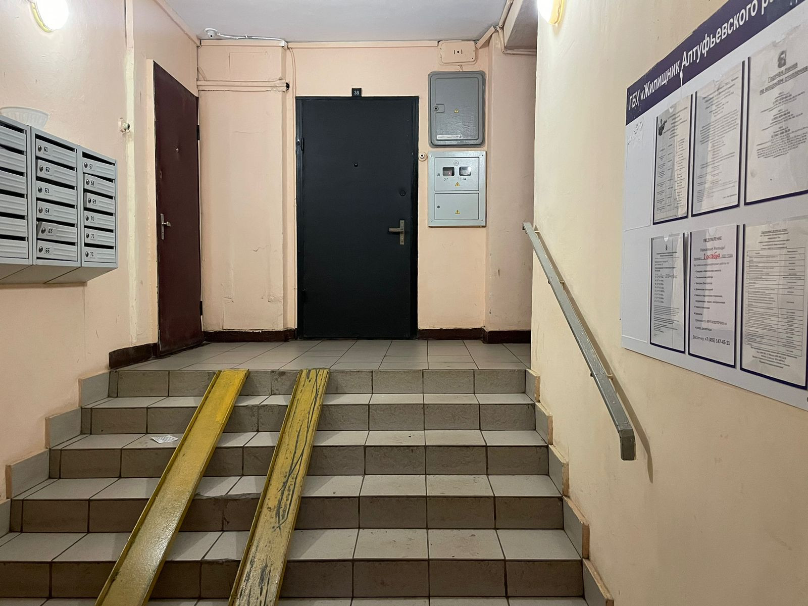 Хорошая железная дверь, общий тамбур с полками для вещей (соседи не пользуются, делали мы для себя).