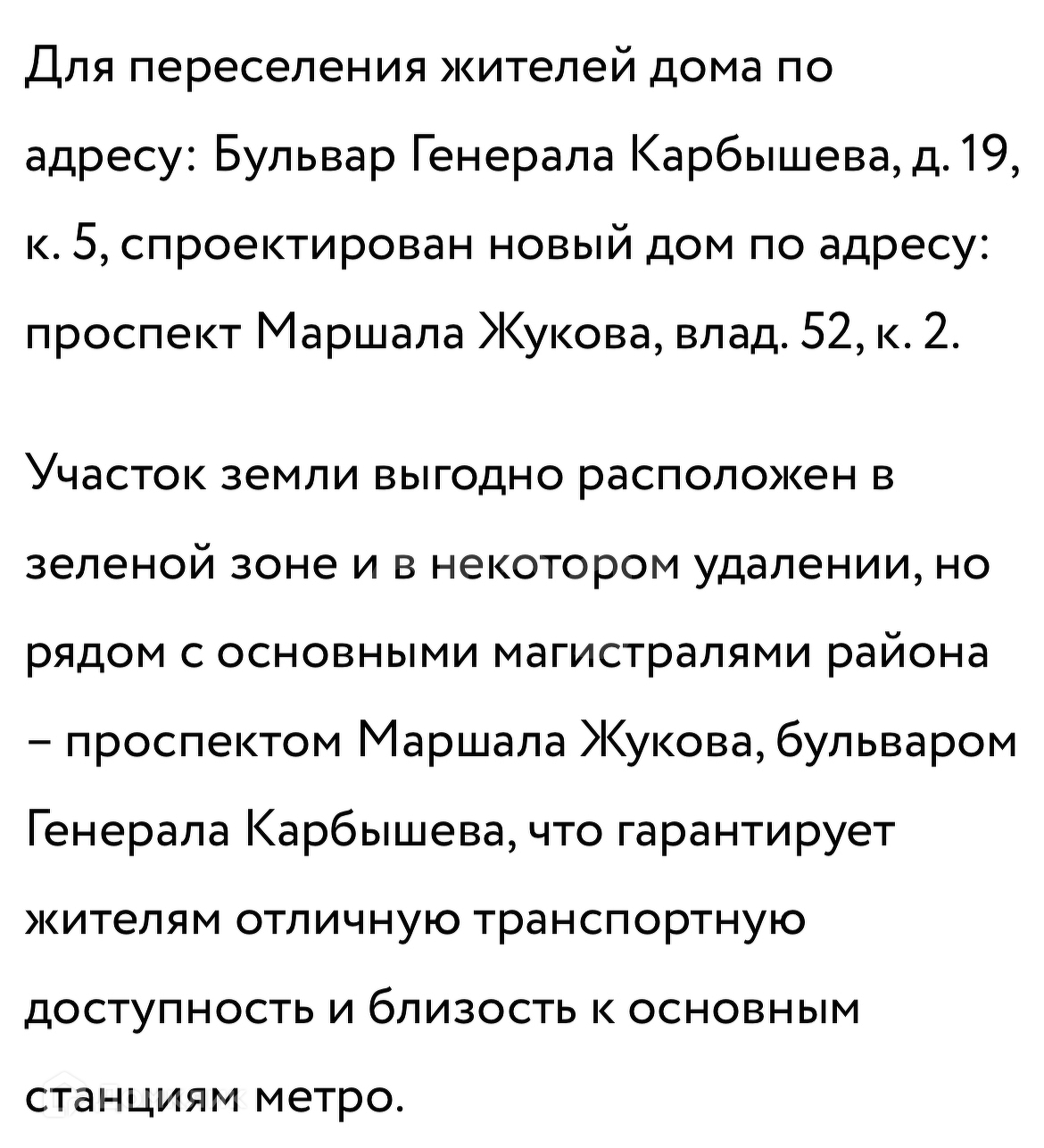 Участники программы к 2025 году получат новое жильё большей площади в том же районе, по адресу: проспект Маршала Жукова 52.