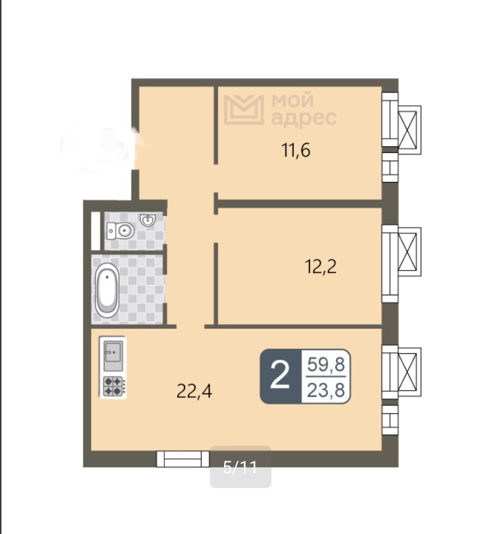 Общая площадь 59.8 м2