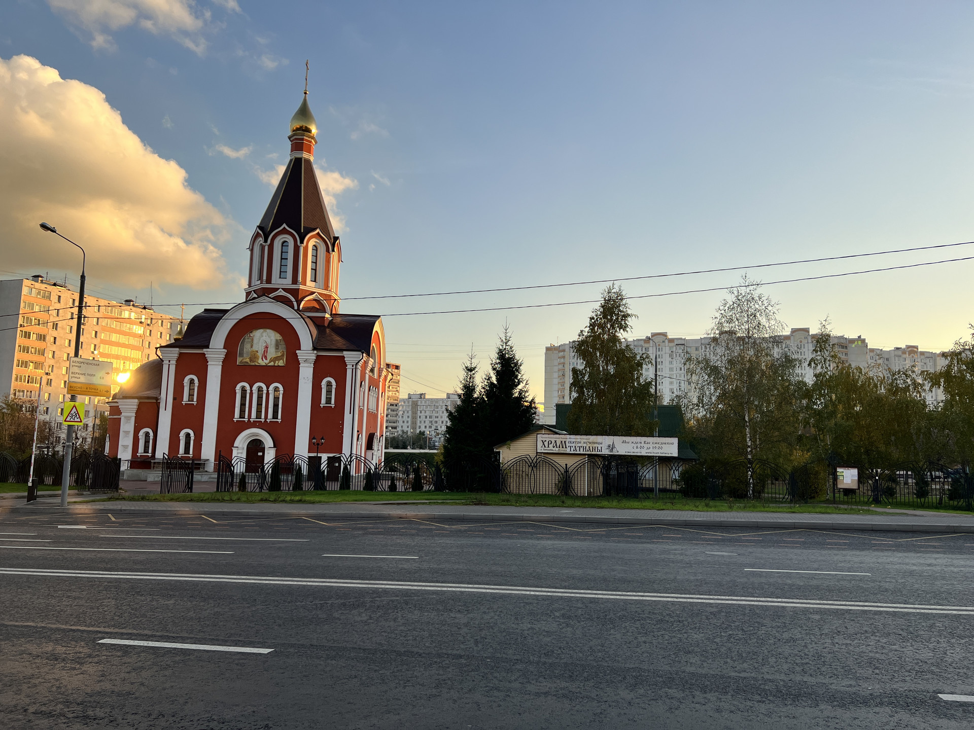 Рядом с метро красивый парк, храм.