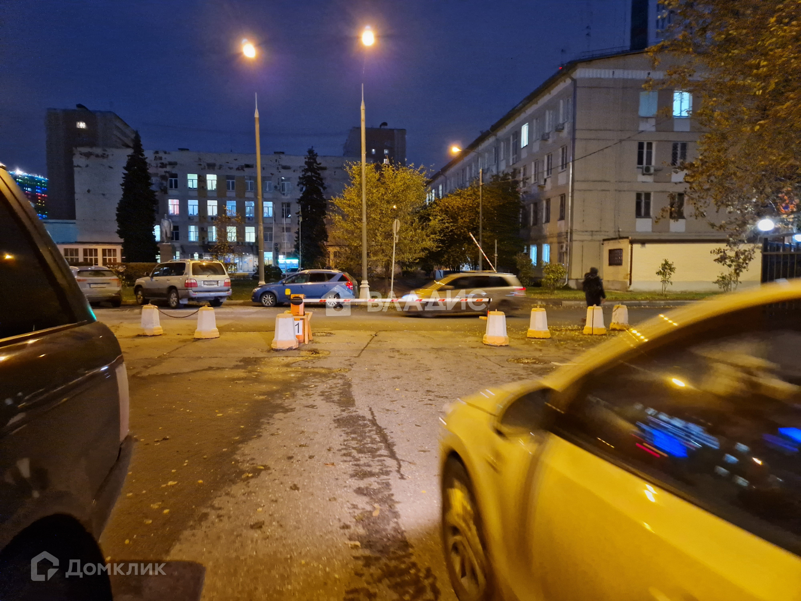 Огороженная территория, въезд через шлагбаум, большая парковочная зона
