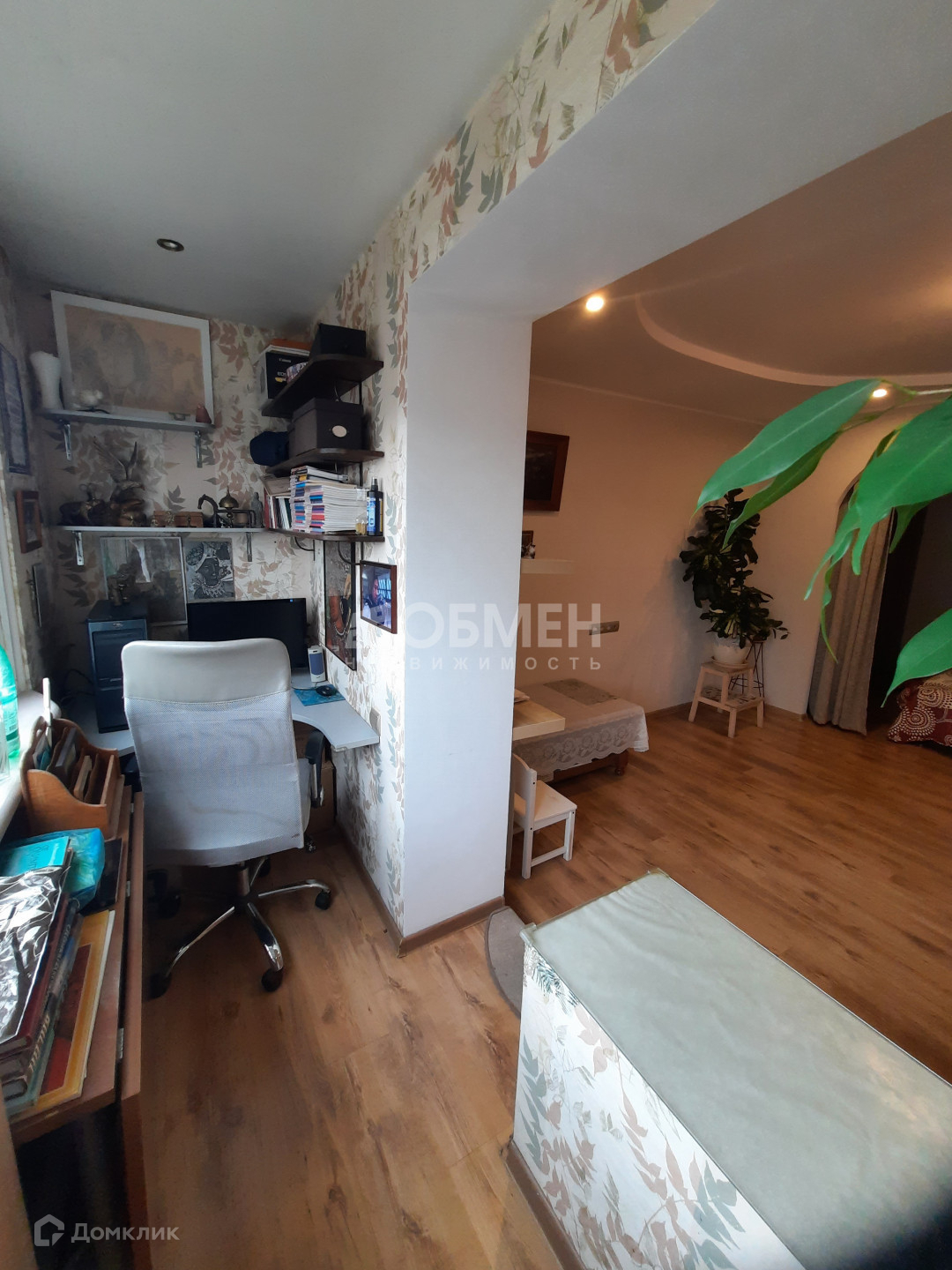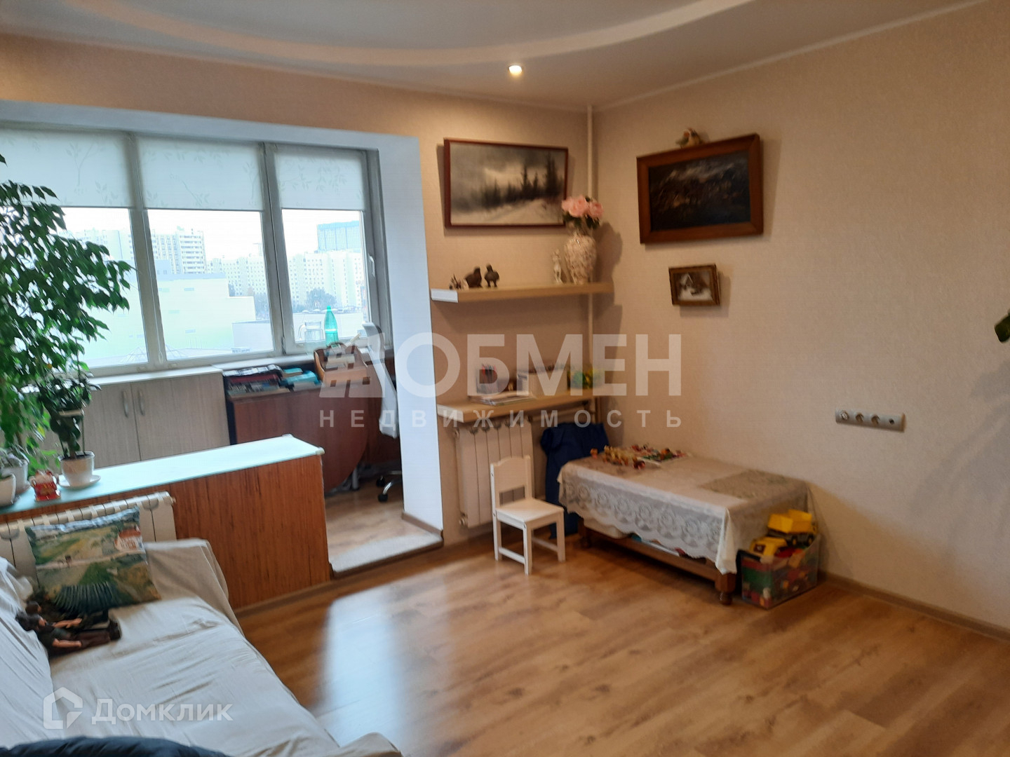 Большая лоджия на комнату и кухню. Лоджия объединена с жилой частью квартиры, несущие конструкции не нарушены, батареи на месте. На лоджии оборудовано рабочее место и места хранения.