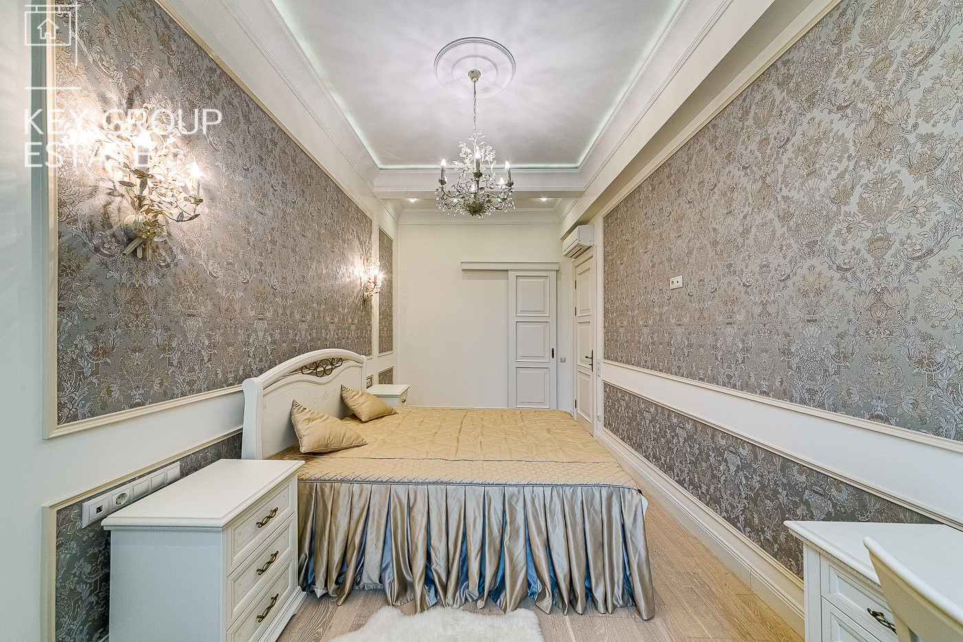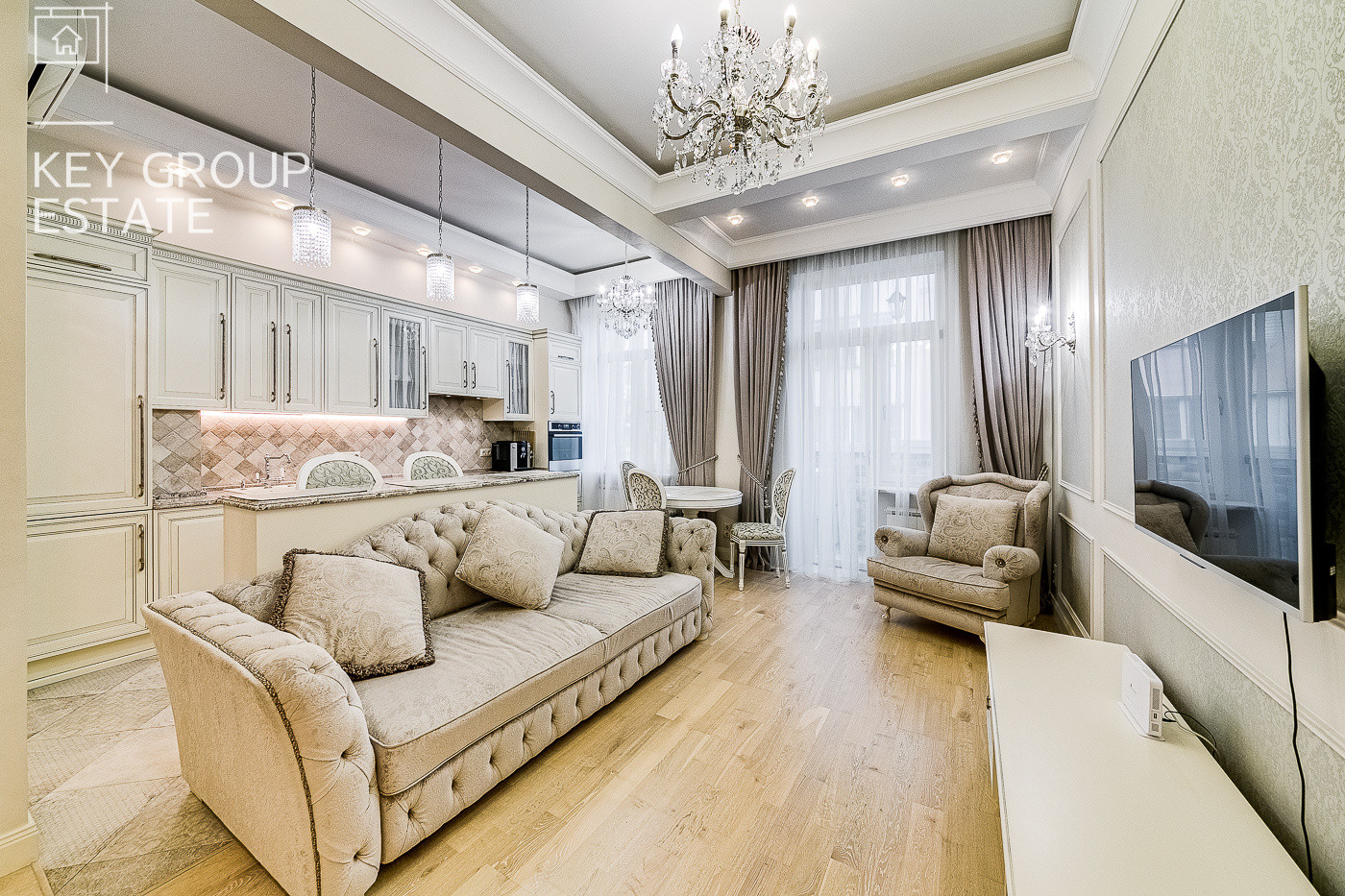 Общая площадь квартиры составляет 86,1 кв.м, включая просторную кухню-гостинную, две спальни, ванную комнату и балкон. Квартира полностью меблирована и оборудована всей необходимой бытовой техникой и мебелью.