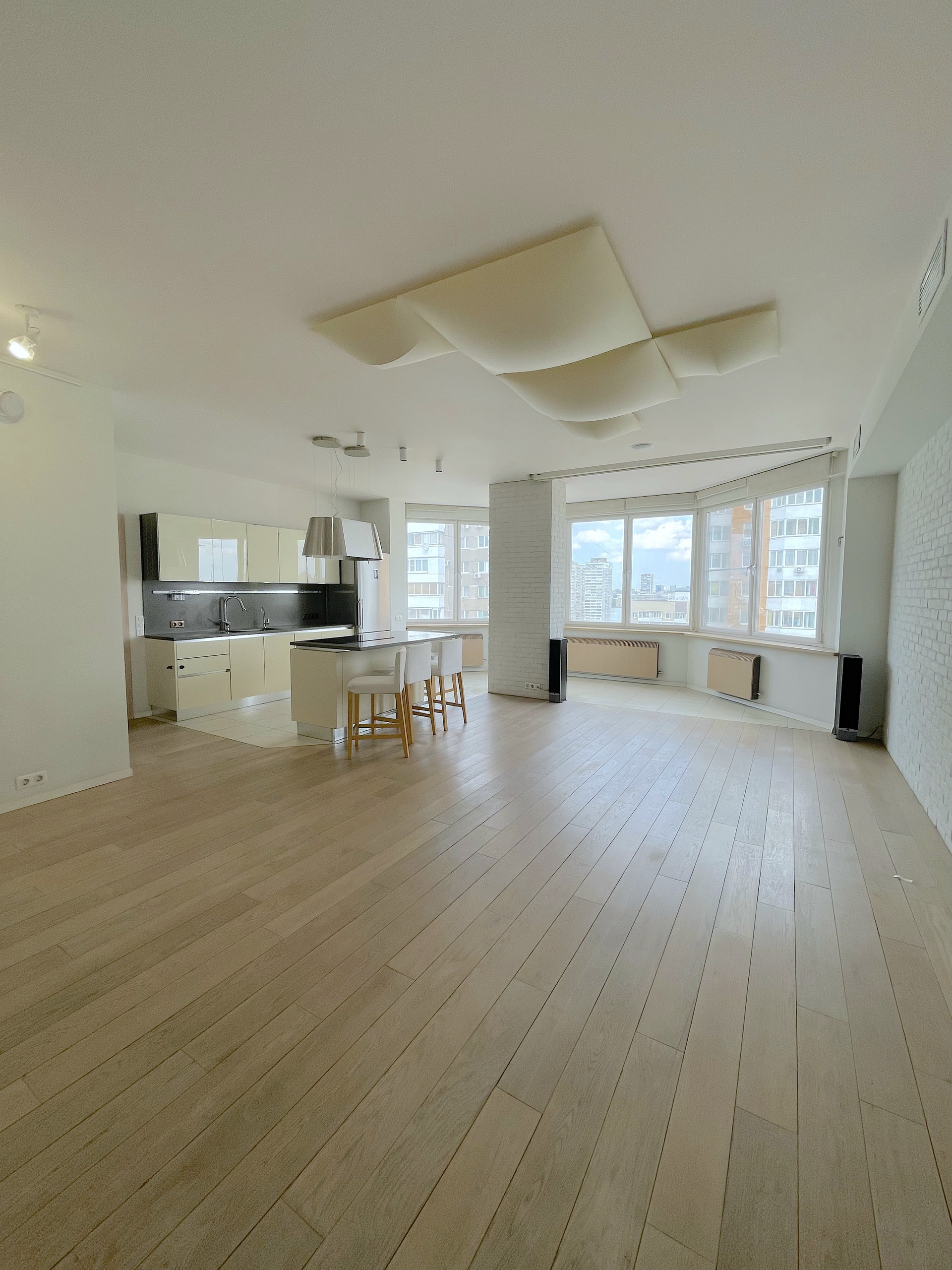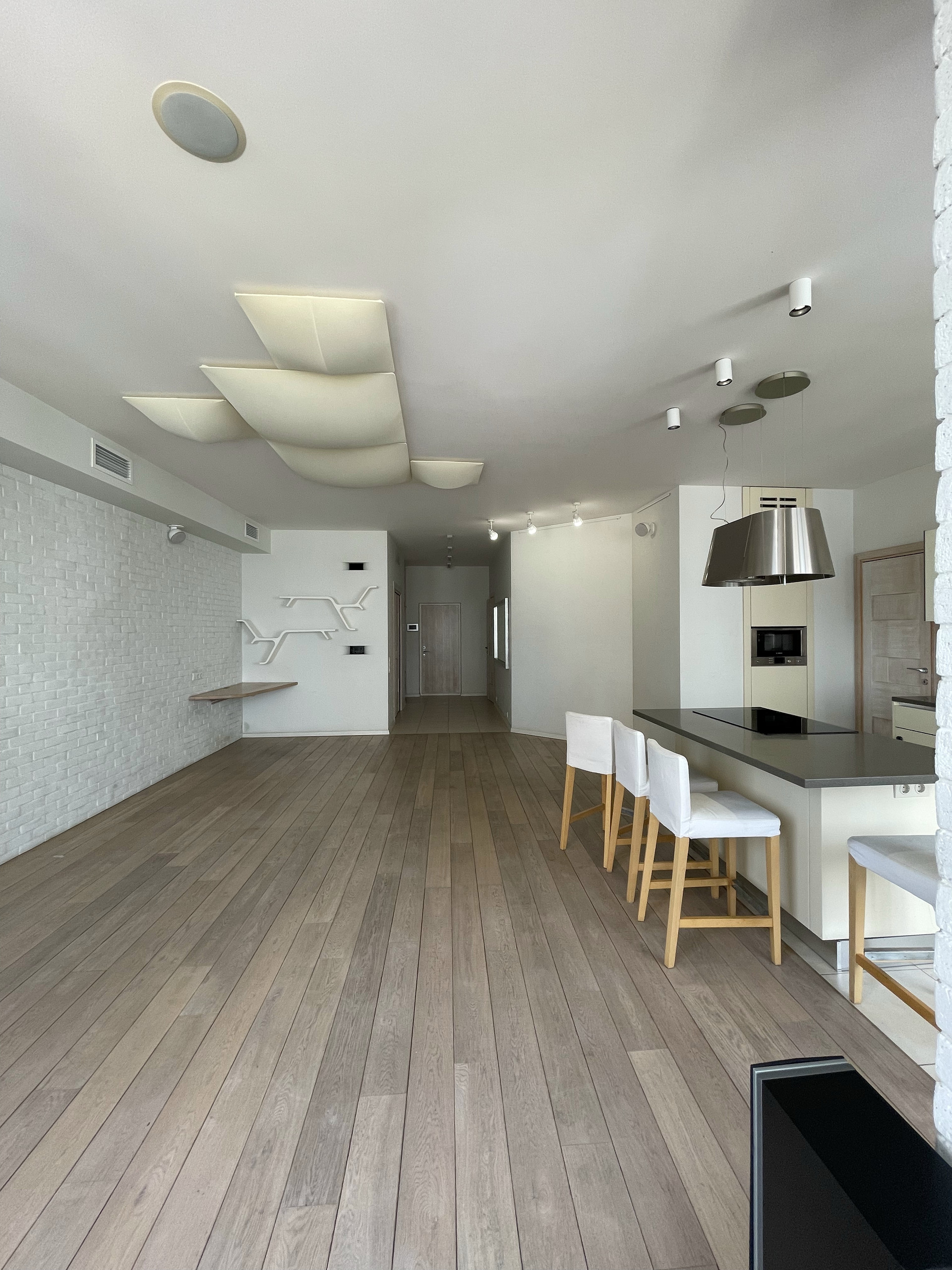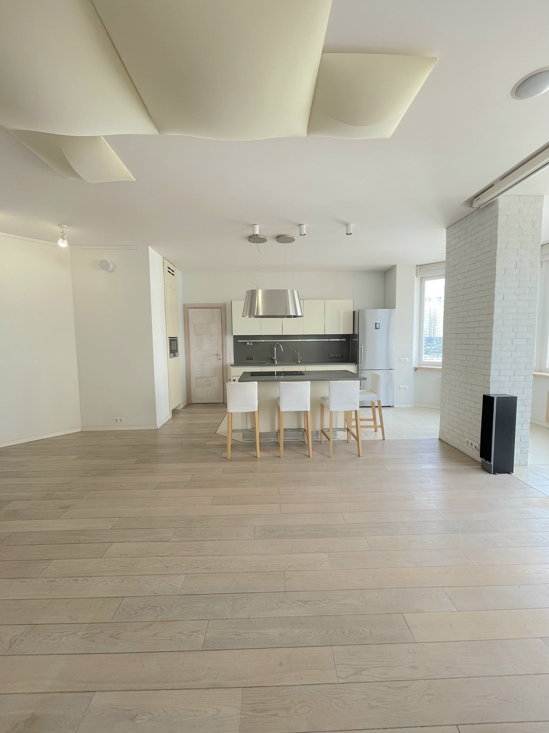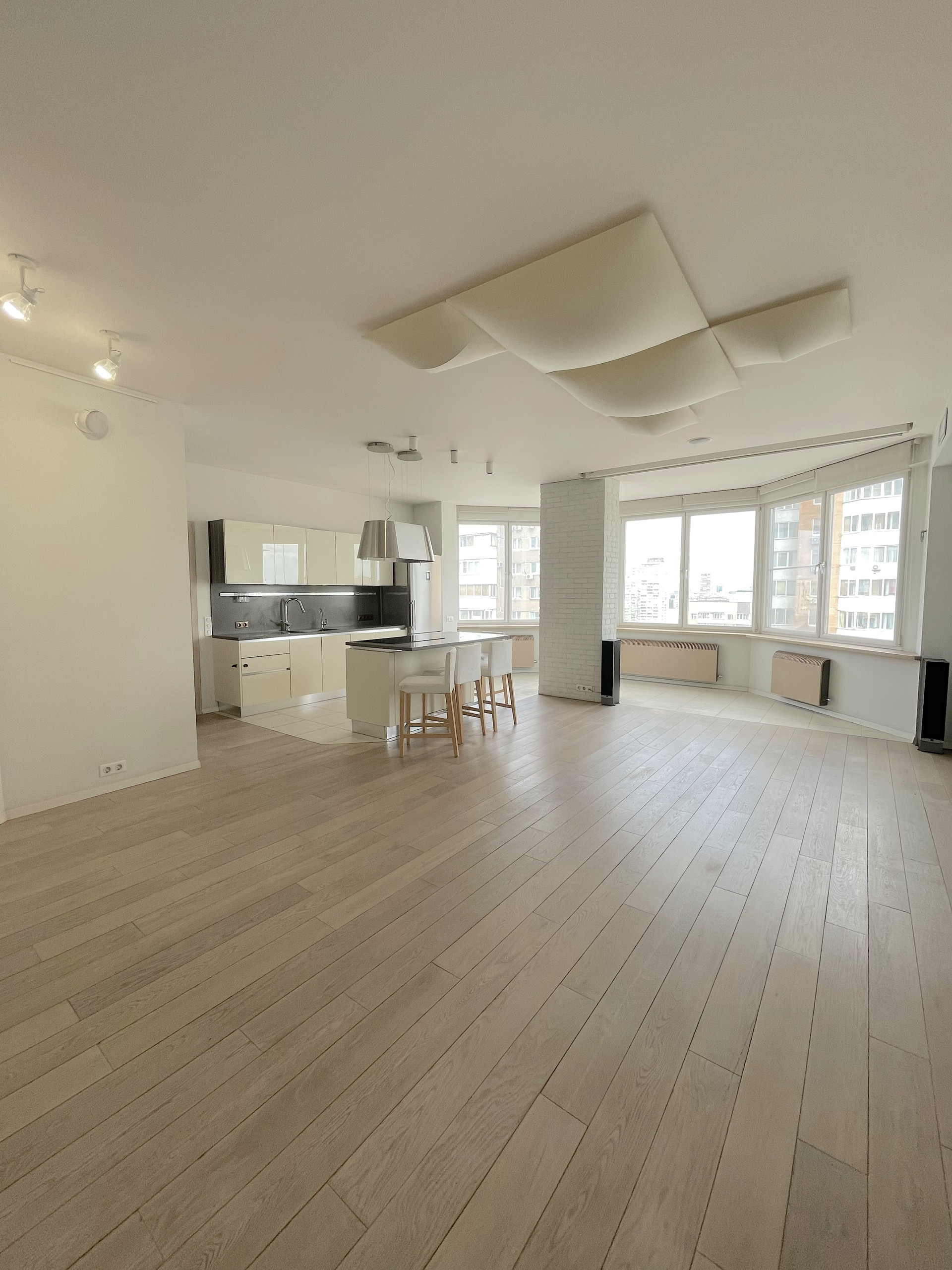 Обе зоны оснащены кондиционерами, в санузлах и на кухне теплые полы, для вашего удобства во время ежегодного отключения горячей воды в квартире есть бойлер. Во всех помещениях организована многоканальная музыкальная система мультирум с центральным управлением. Гостиная легко превращается в домашний кинотеатр благодаря встроенному в потолок экрану для проектора и плотным римским шторам.
