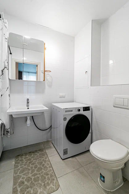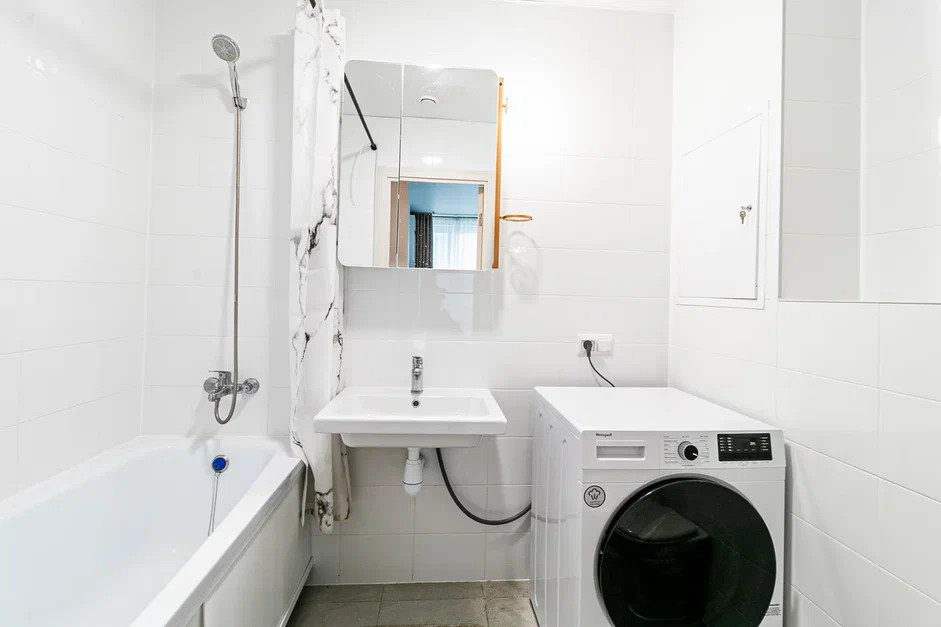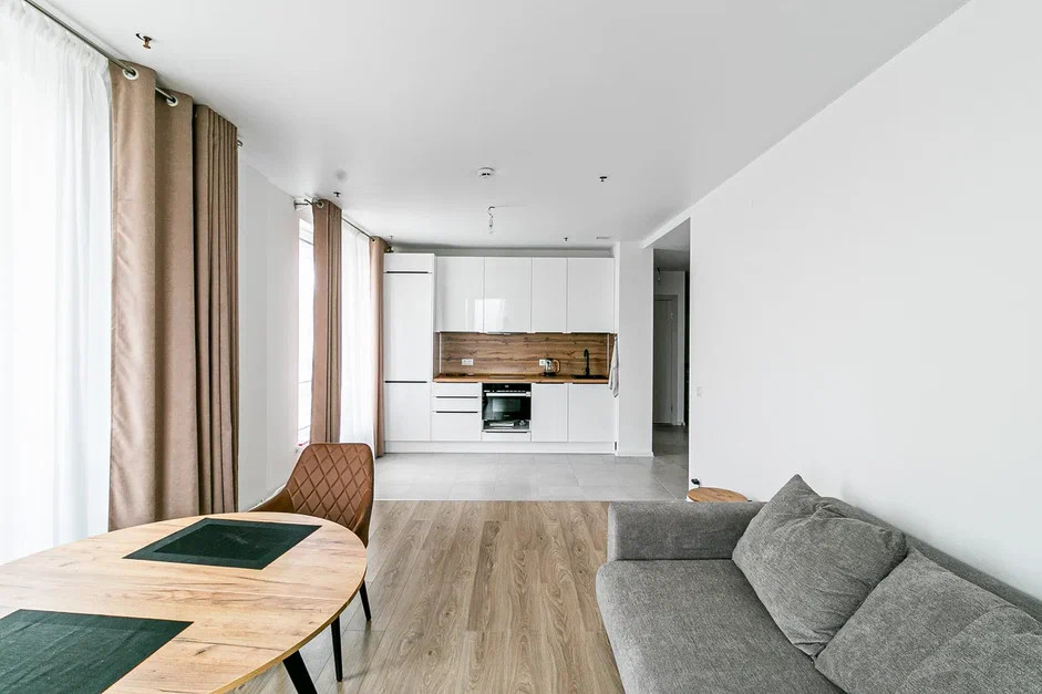 В апартаменте хороший качественный ремонт. 2 санузла, 2 отдельных комнаты и кухня-гостиная.
