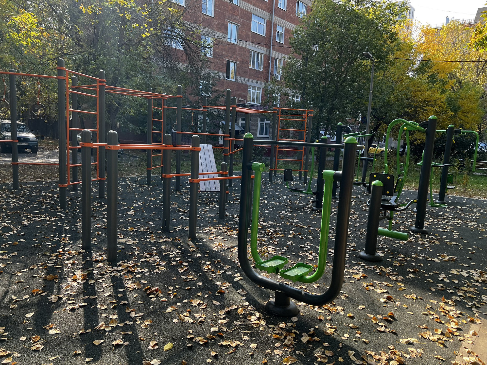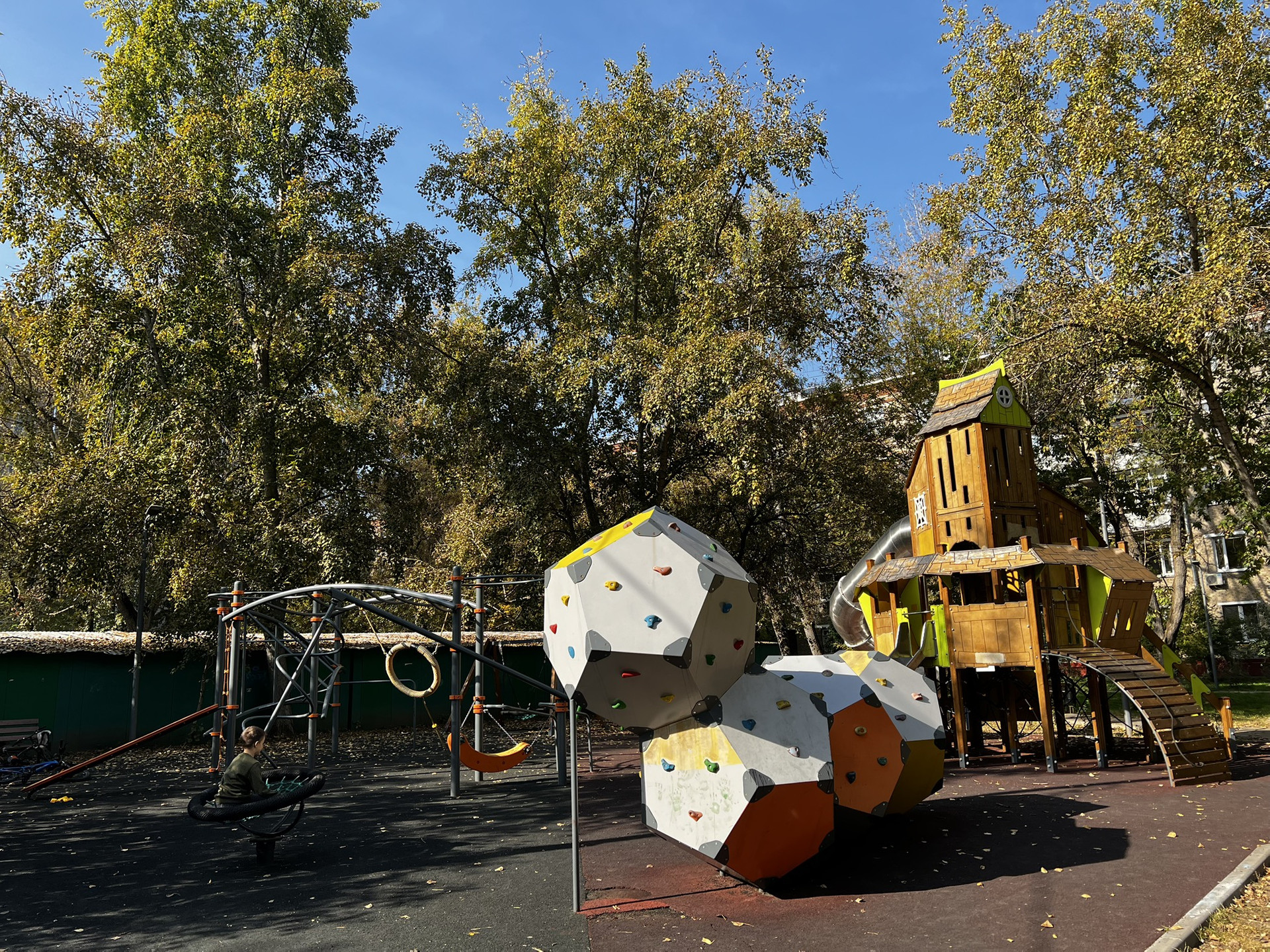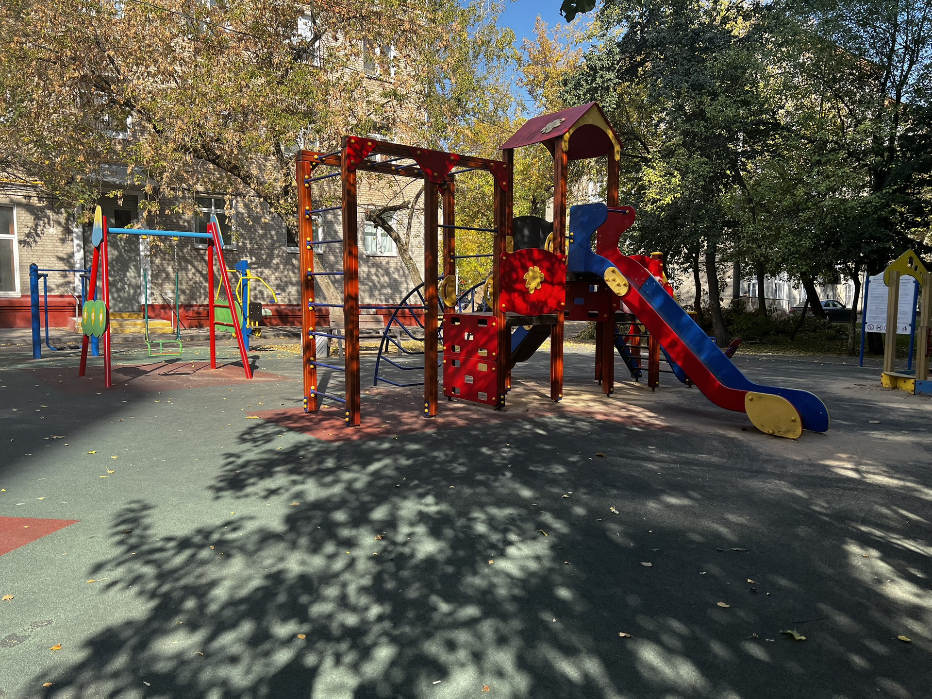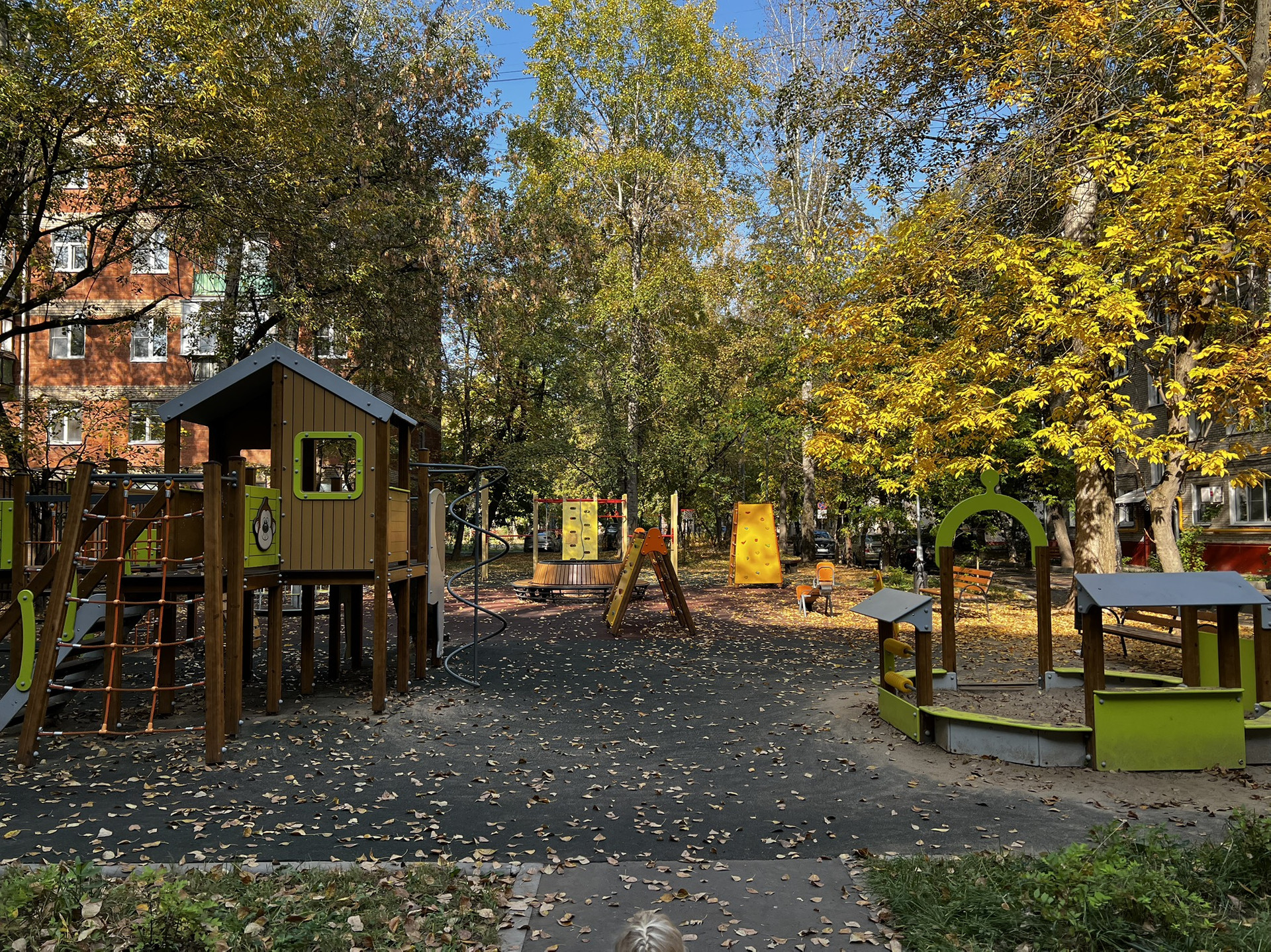 Общая дворовая территория у девяти сталинских домов закрыта 6-ю шлагбаумами (ключ есть ото всех) на территории три детских площадки.