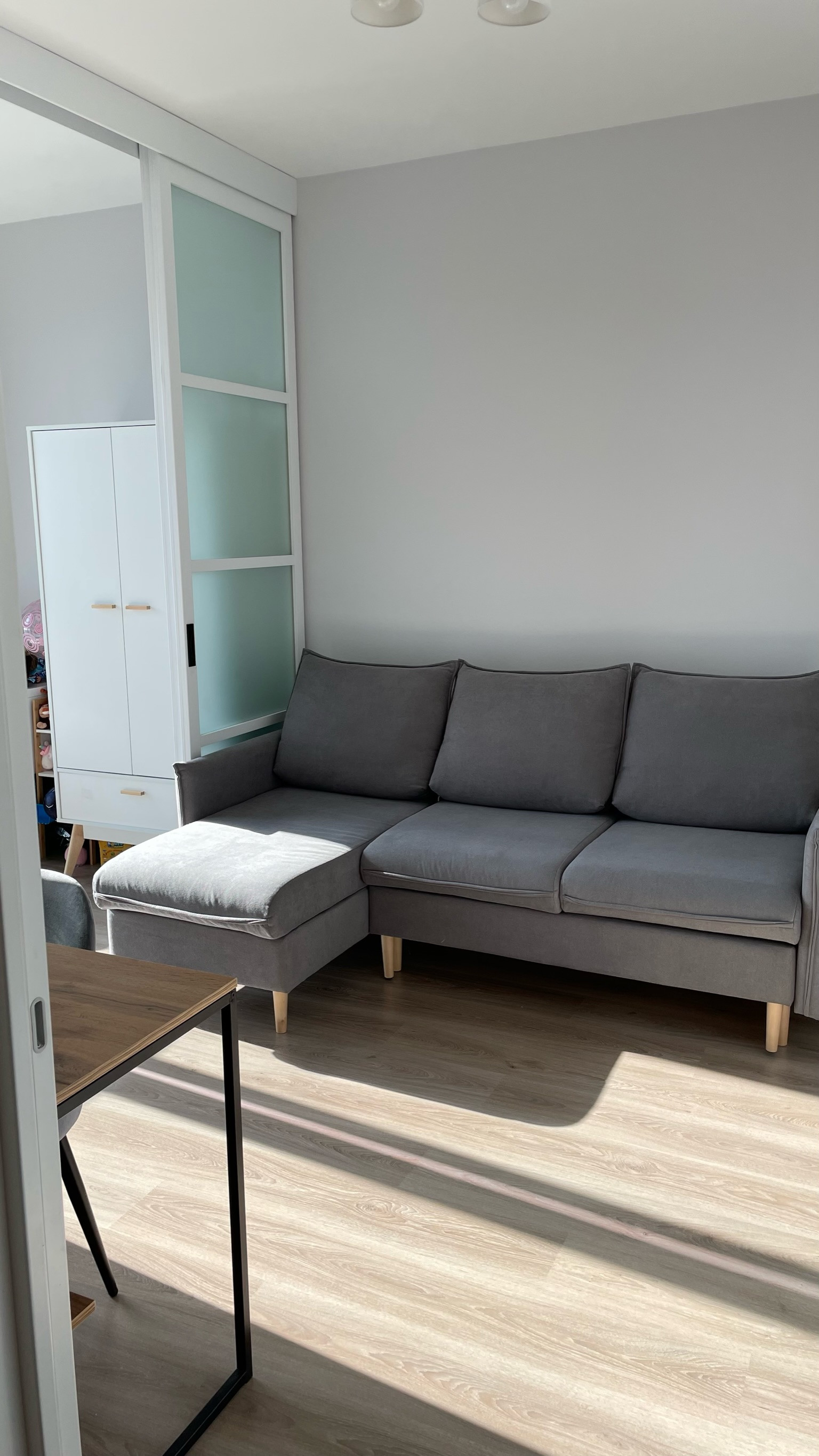 - В комнате раздвижная перегородка (детская/спальная зона у окна отделена от зоны гостиной); при необходимости демонтируется без повреждения напольного покрытия.