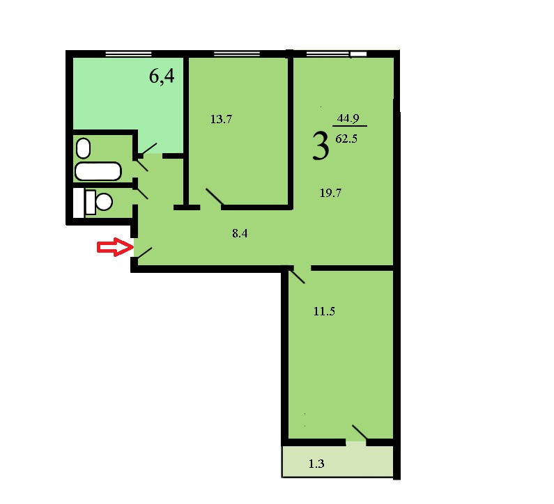 Жилая площадь 44.9 м2