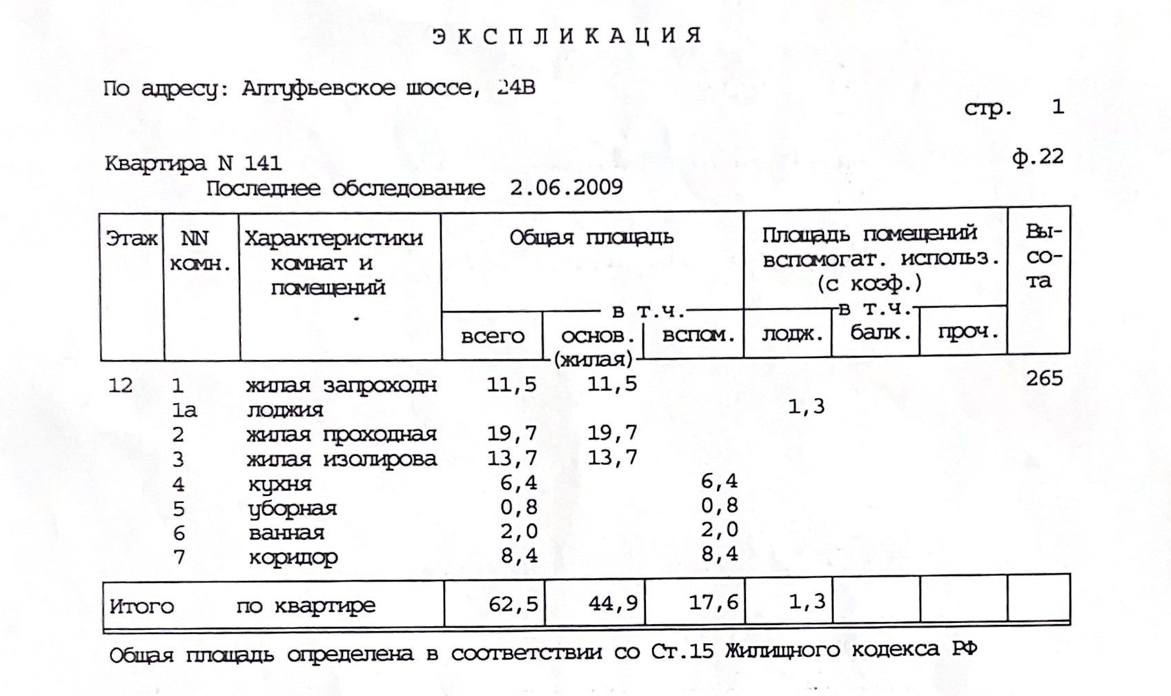 Общая площадь 62.5 м2