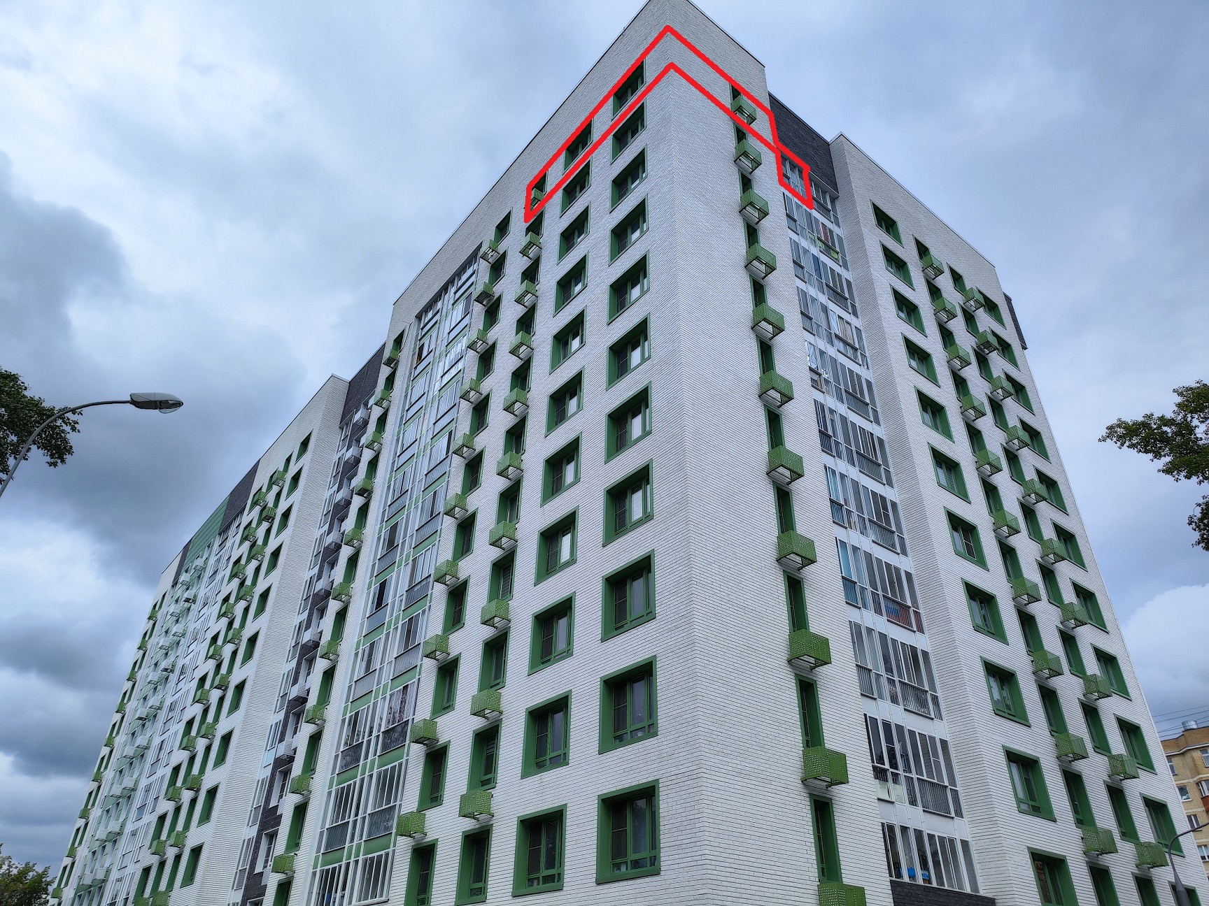 Современный монолитный дом с большим подземным паркингом расположен в районе с исторической малоэтажной застройкой.