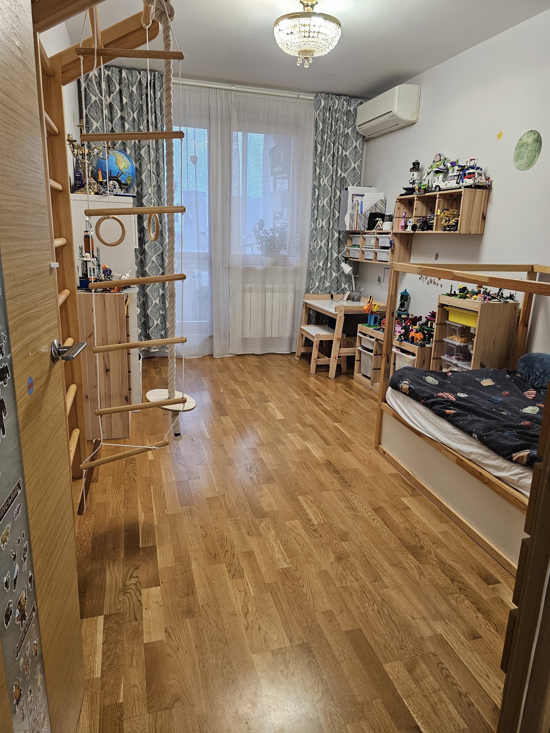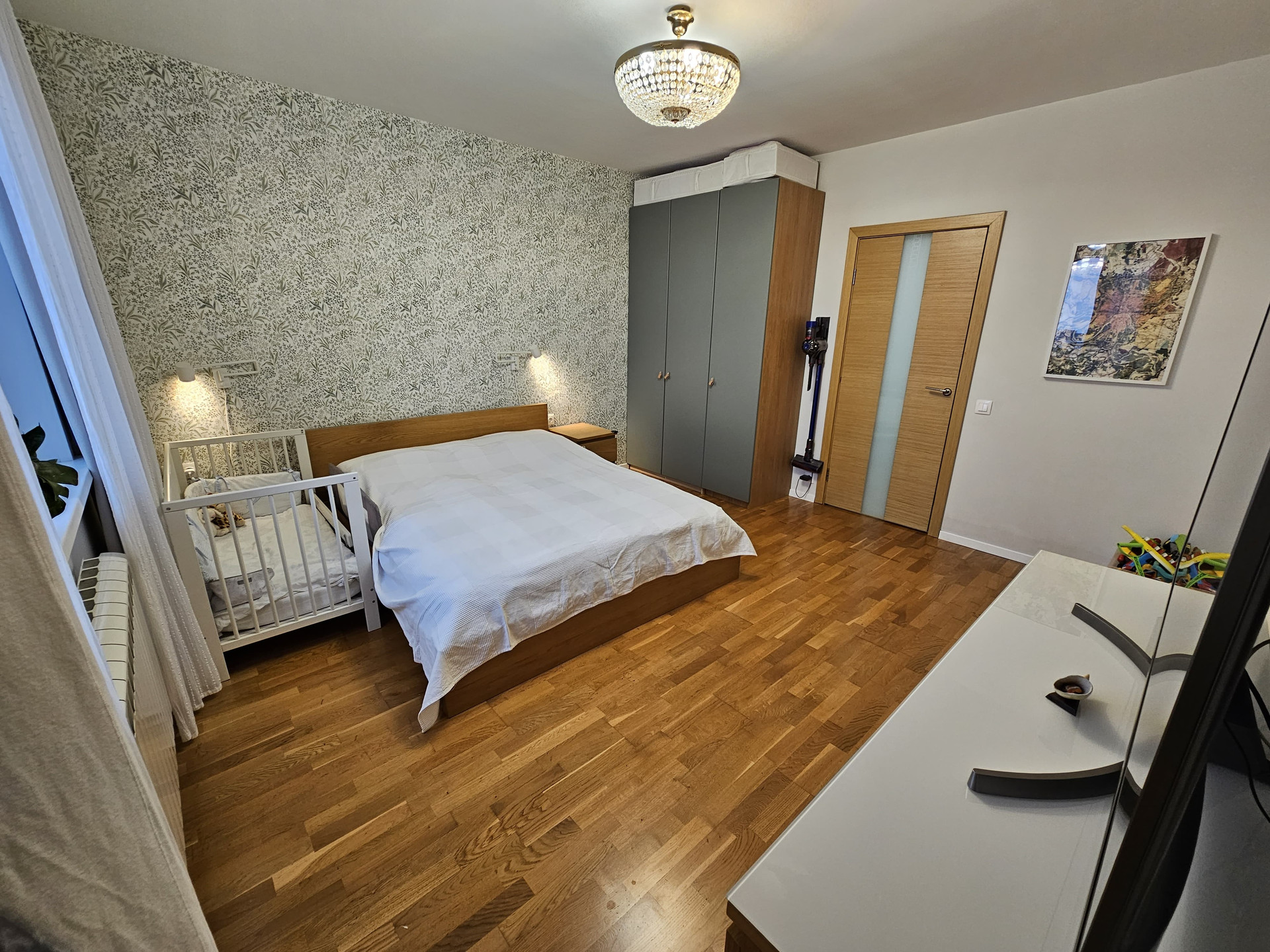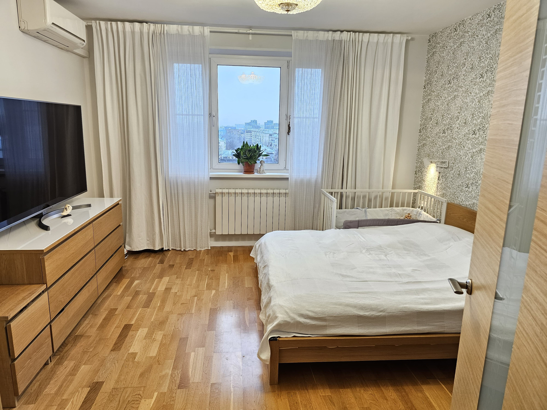 При ремонте заменена и усилена проводка и другие коммуникации. В этом году заменены все счетчики. Новые стеклопакеты, качественные кондиционеры в каждой комнате, много розеток. Комнаты изолированные, на полу паркетная доска.
