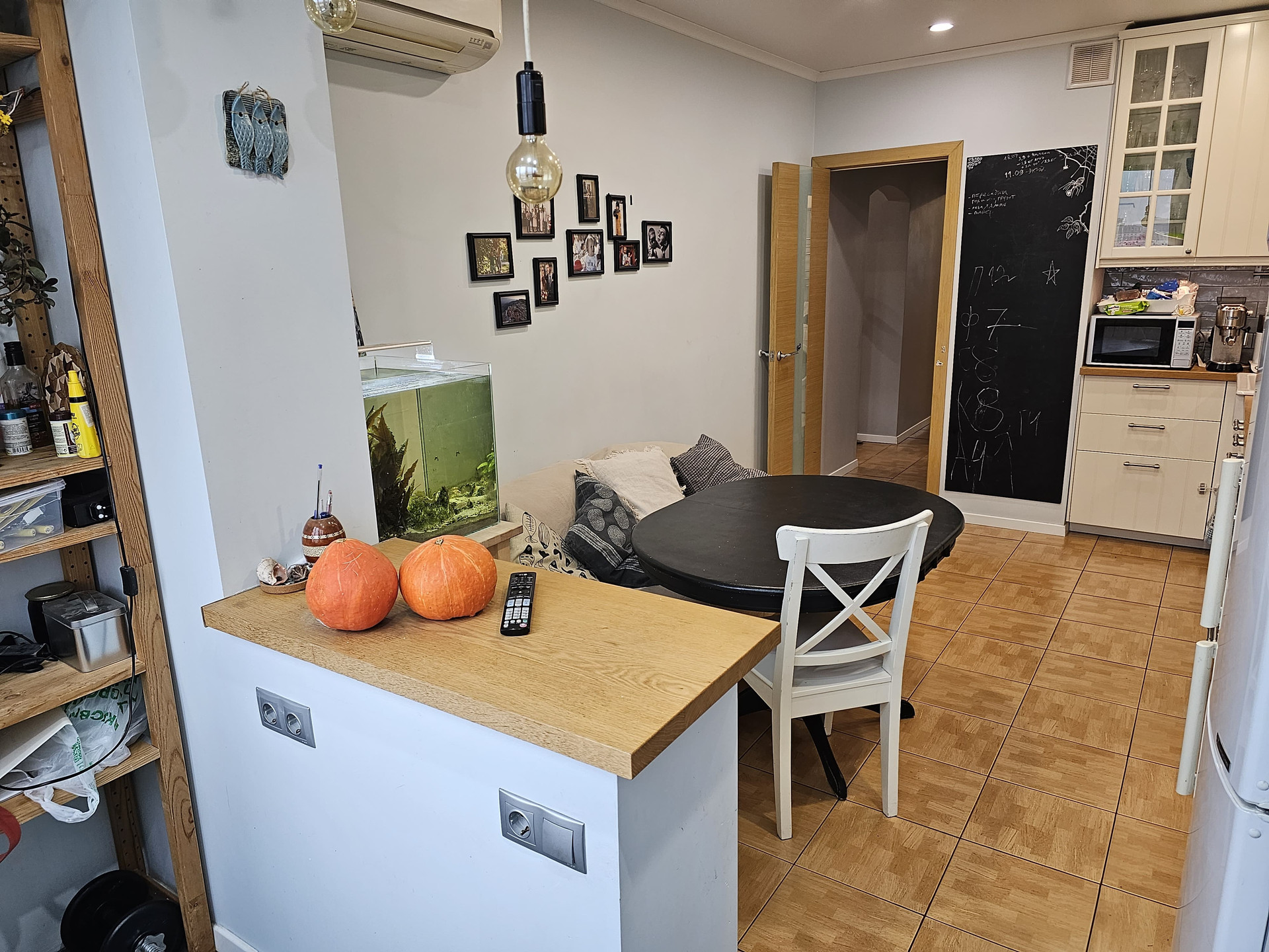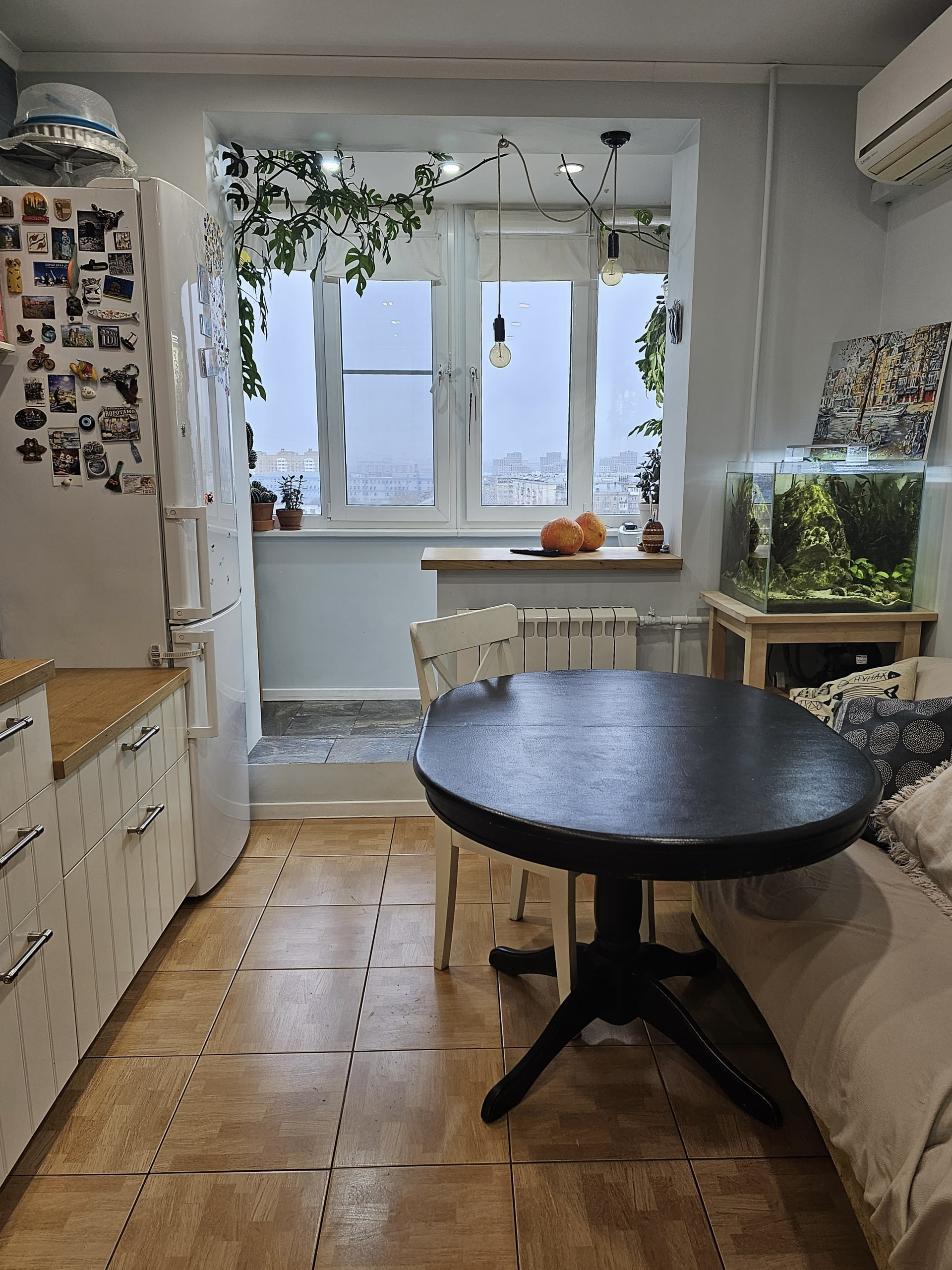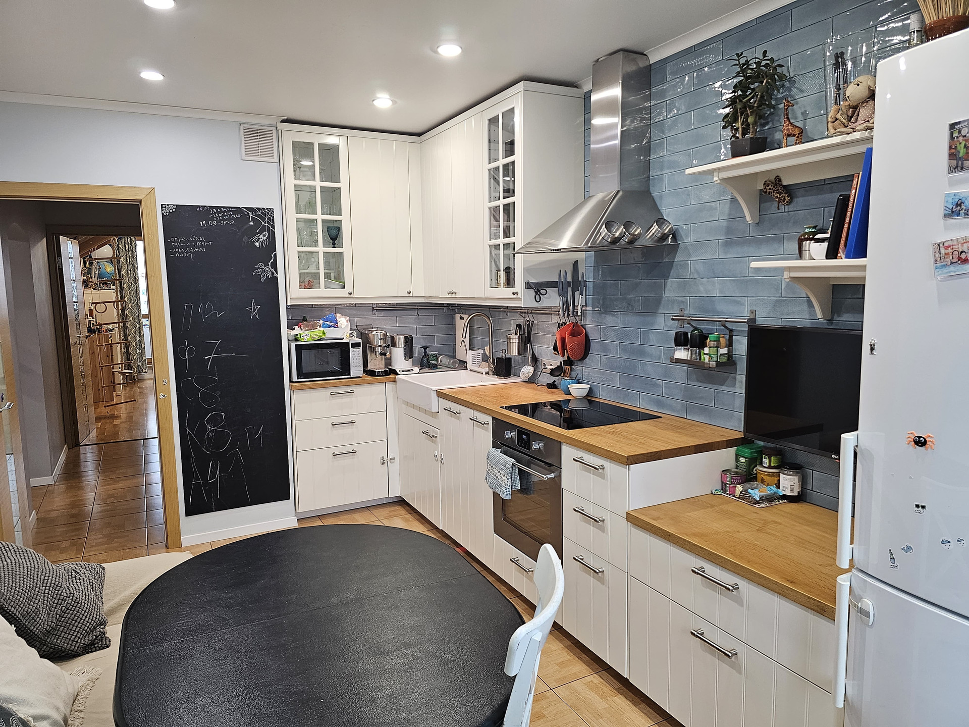 Большая кухня 12кв.м., дополнительно увеличенная за счет утепленной лоджии (теплый пол). Посудомоечная машина, индукционная плита, духовка, вытяжка, большая раковина.
