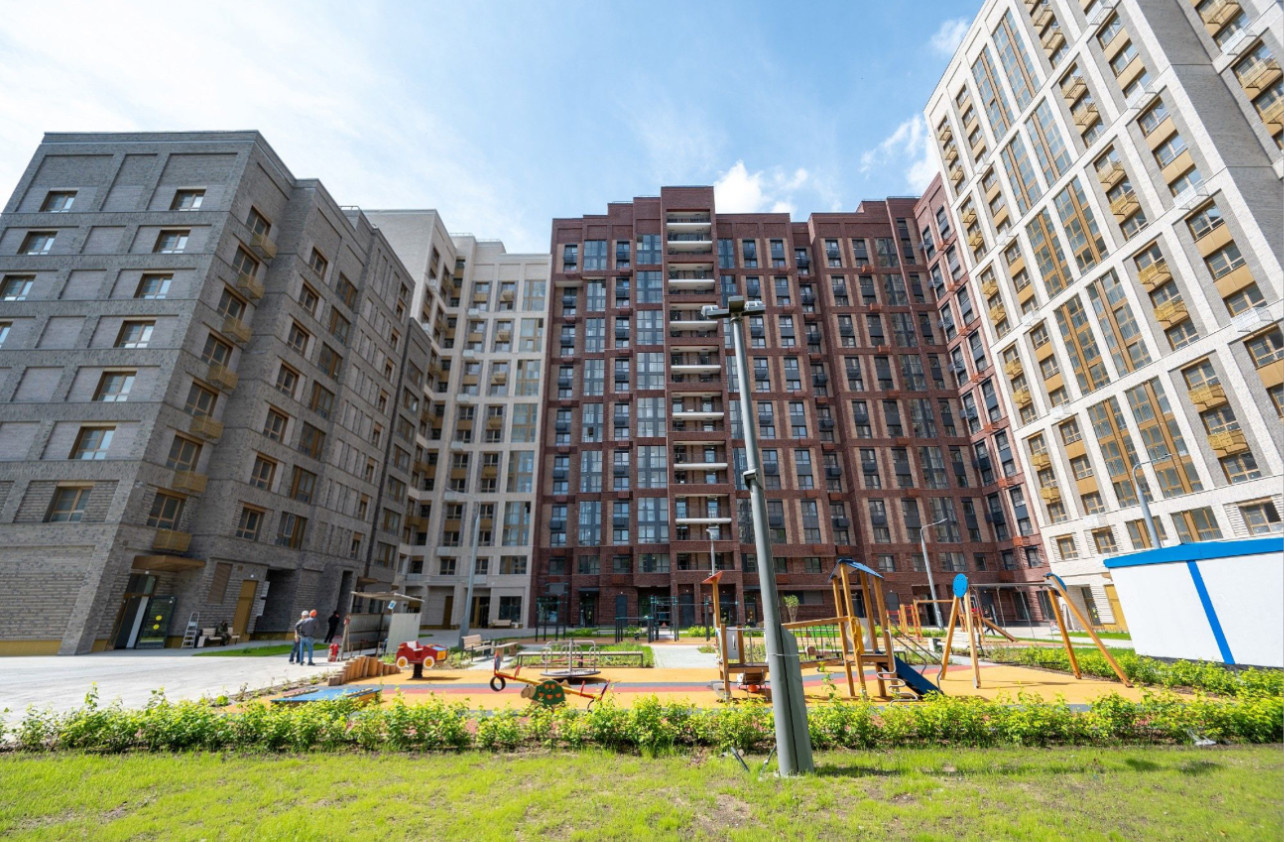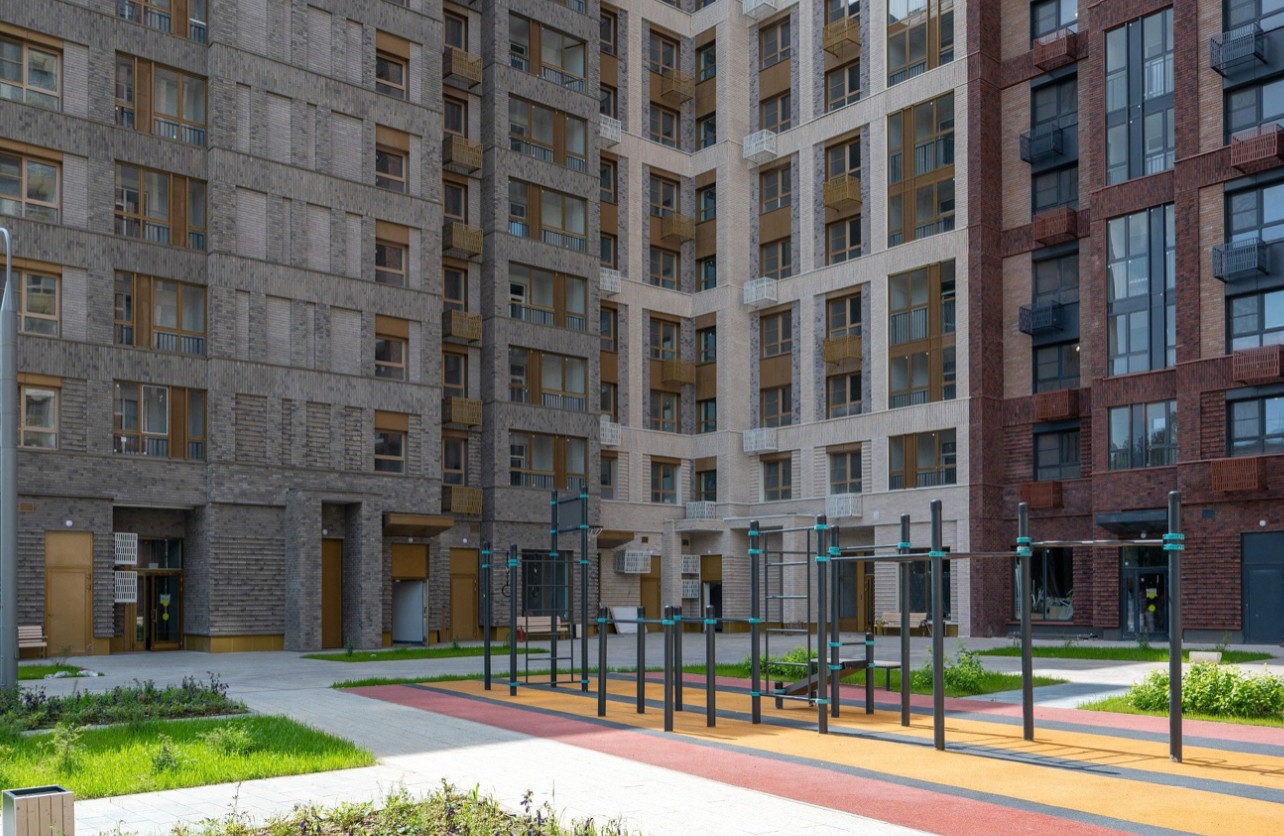 Детская площадка и места отдыха прямо перед домом (в собственном дворе), въезд на территорию ограничивает шлагбаум.